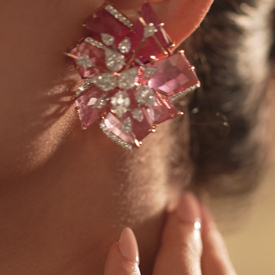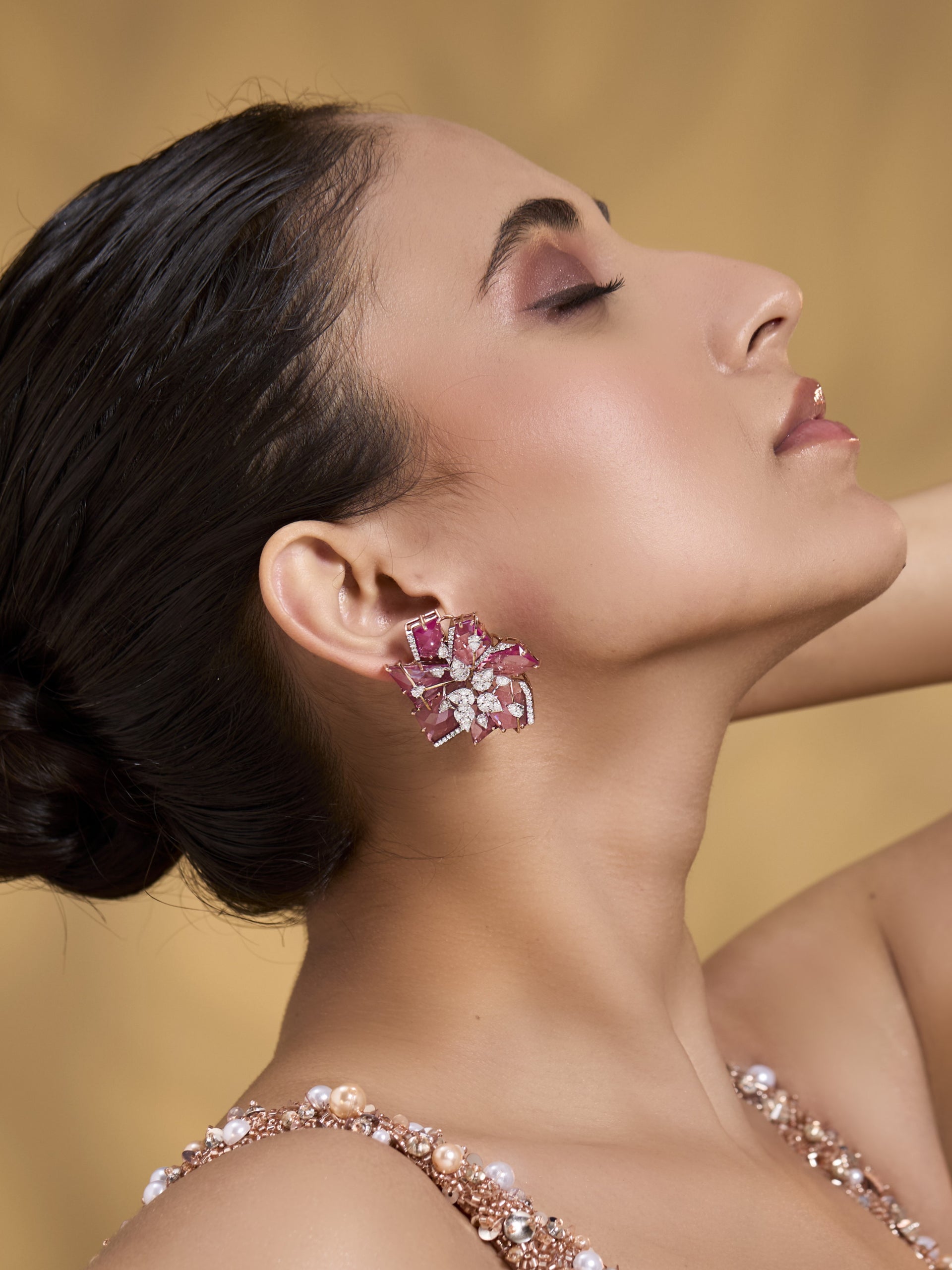 These dramatic earrings feature asymmetric pink diamonds intricately sculpted in a blooming floral arrangement, accentuated with white pear diamonds. Perfect for glamorous occasions, these earrings blend architectural form with vibrant femininity.