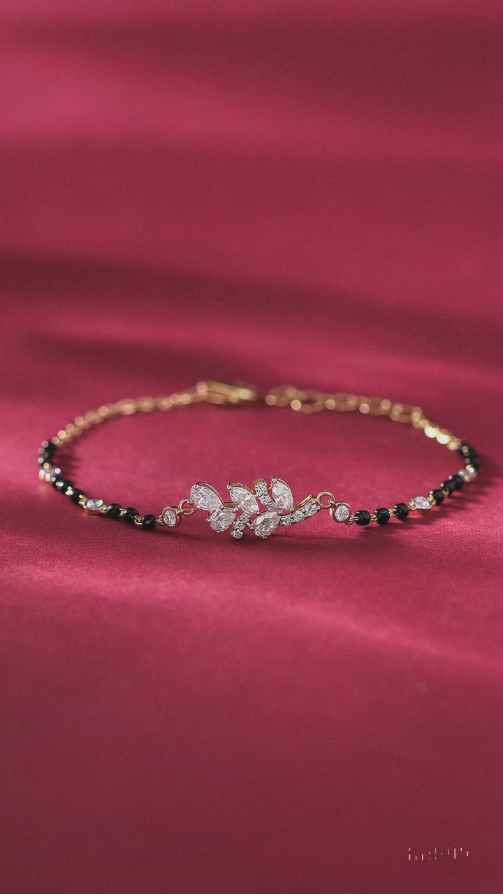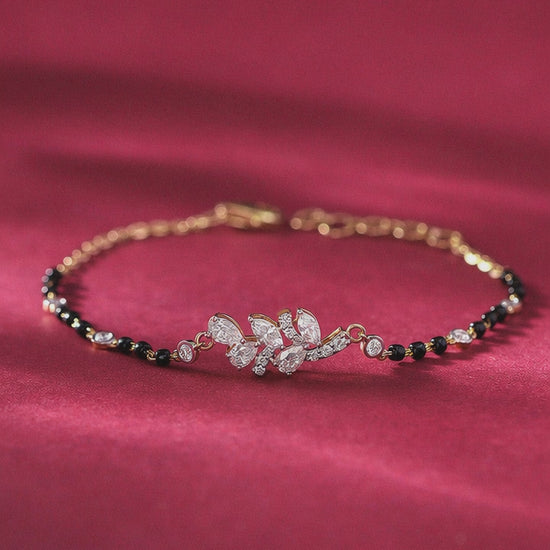 Inspired by petals in bloom, a central round diamond radiates brilliance within delicate motifs. This mangalsutra bracelet embodies romance and grace, crafted for everyday elegance while honoring the eternal bond of marriage.