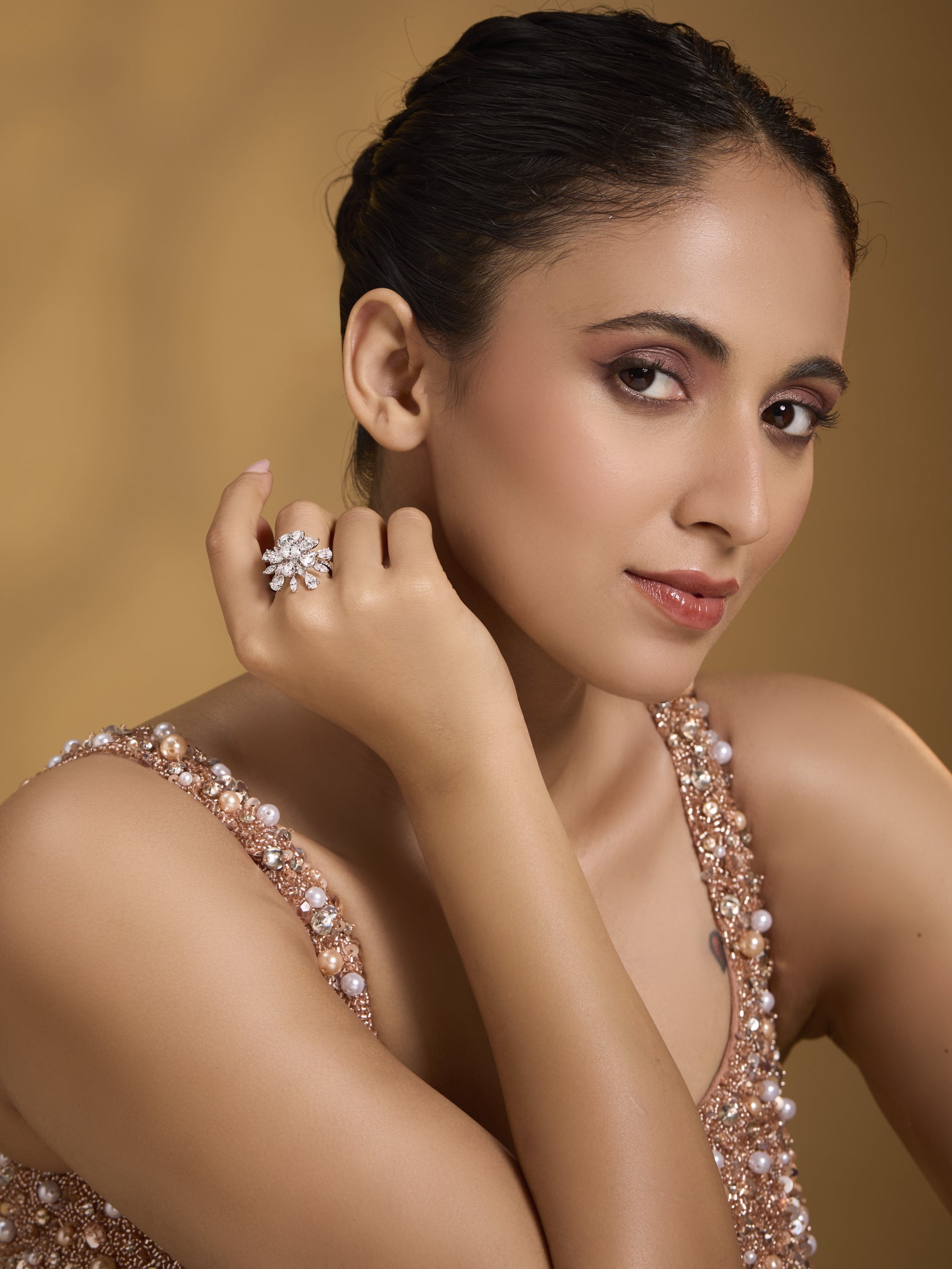 A stunning floral-inspired design, this statement ring features a dazzling oval-cut diamond at the center, encircled by intricately arranged marquise and pear-shaped diamonds. The combination evokes a blooming flower, exuding brilliance and grace with every movement.