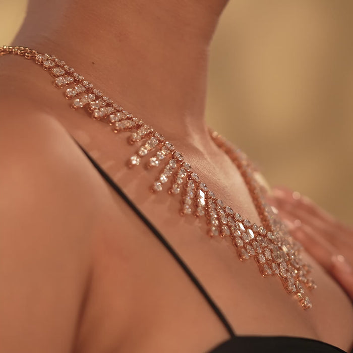 This radiant necklace showcases a graduating cascade of oval, emerald and pear-shaped lab-grown diamonds, perfectly arranged to frame your neckline with brilliance and grace. With its collar-style silhouette and intricate setting, this necklace blends traditional opulence with modern flair.