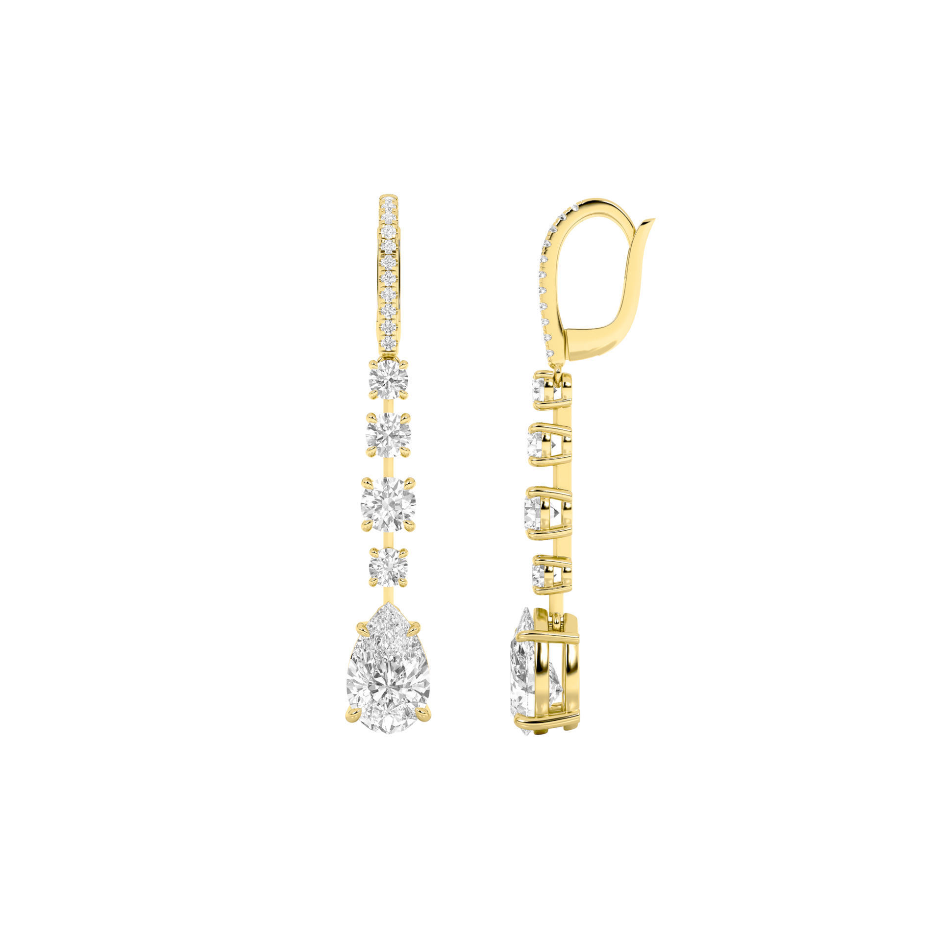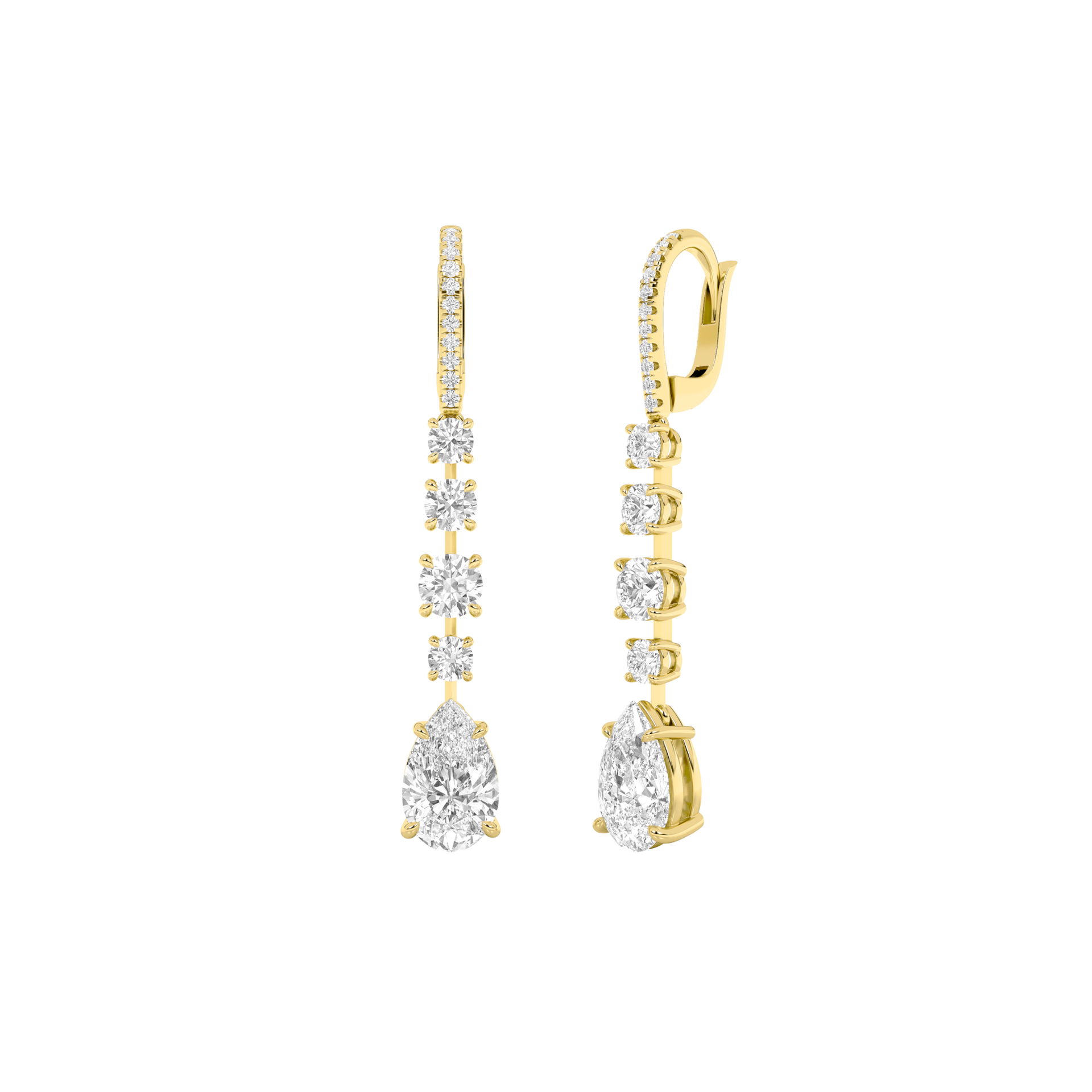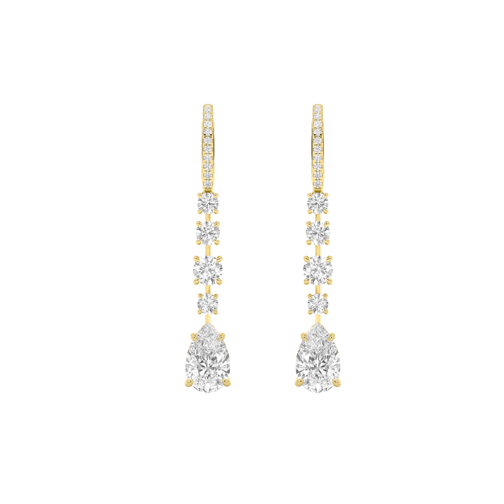 Round diamonds ascend in graceful sequence, flowing into a luminous pear-shaped drop. Inspired by cascading light, these earrings create movement and brilliance, perfect for evening glamour, anniversary gifting, or a modern bridal look.