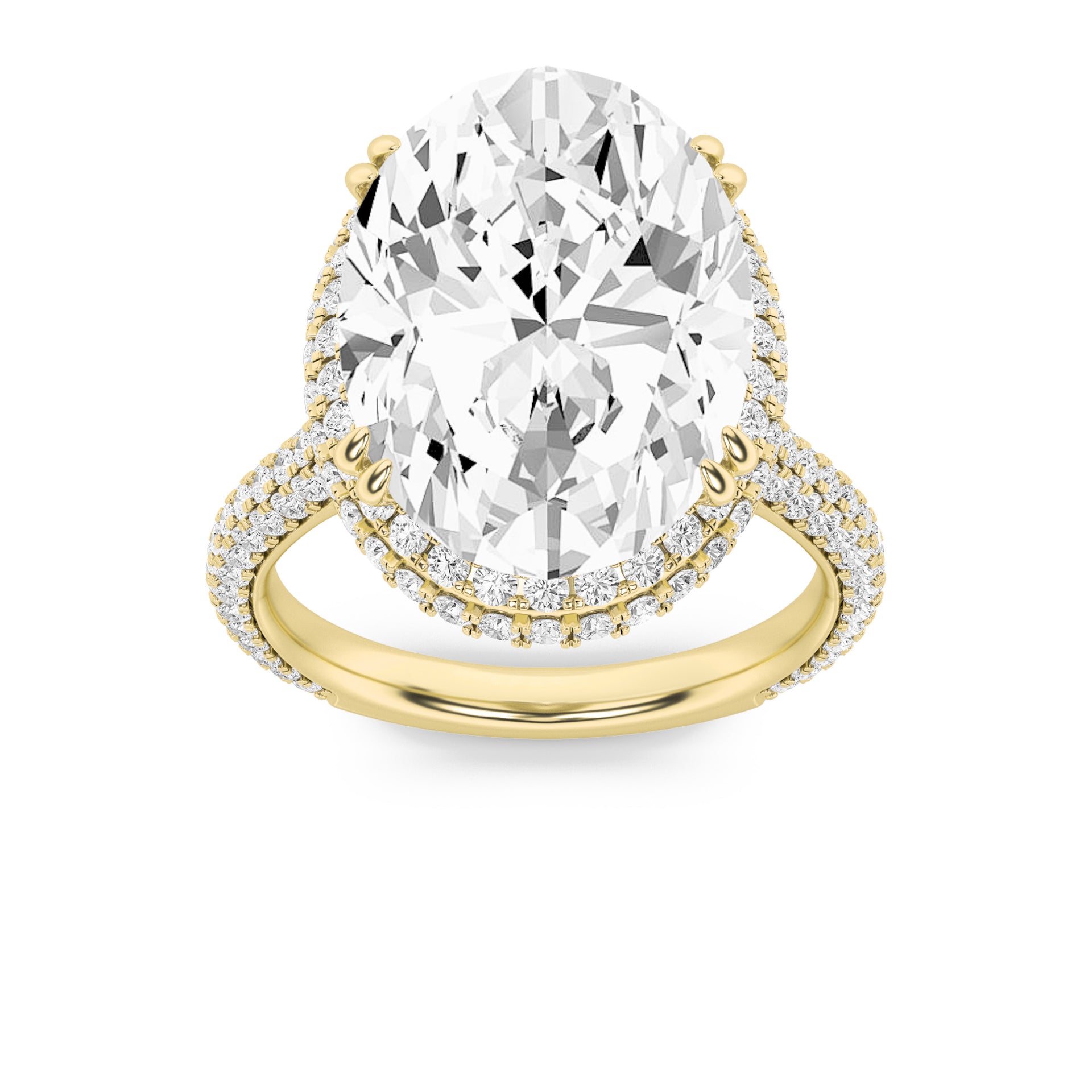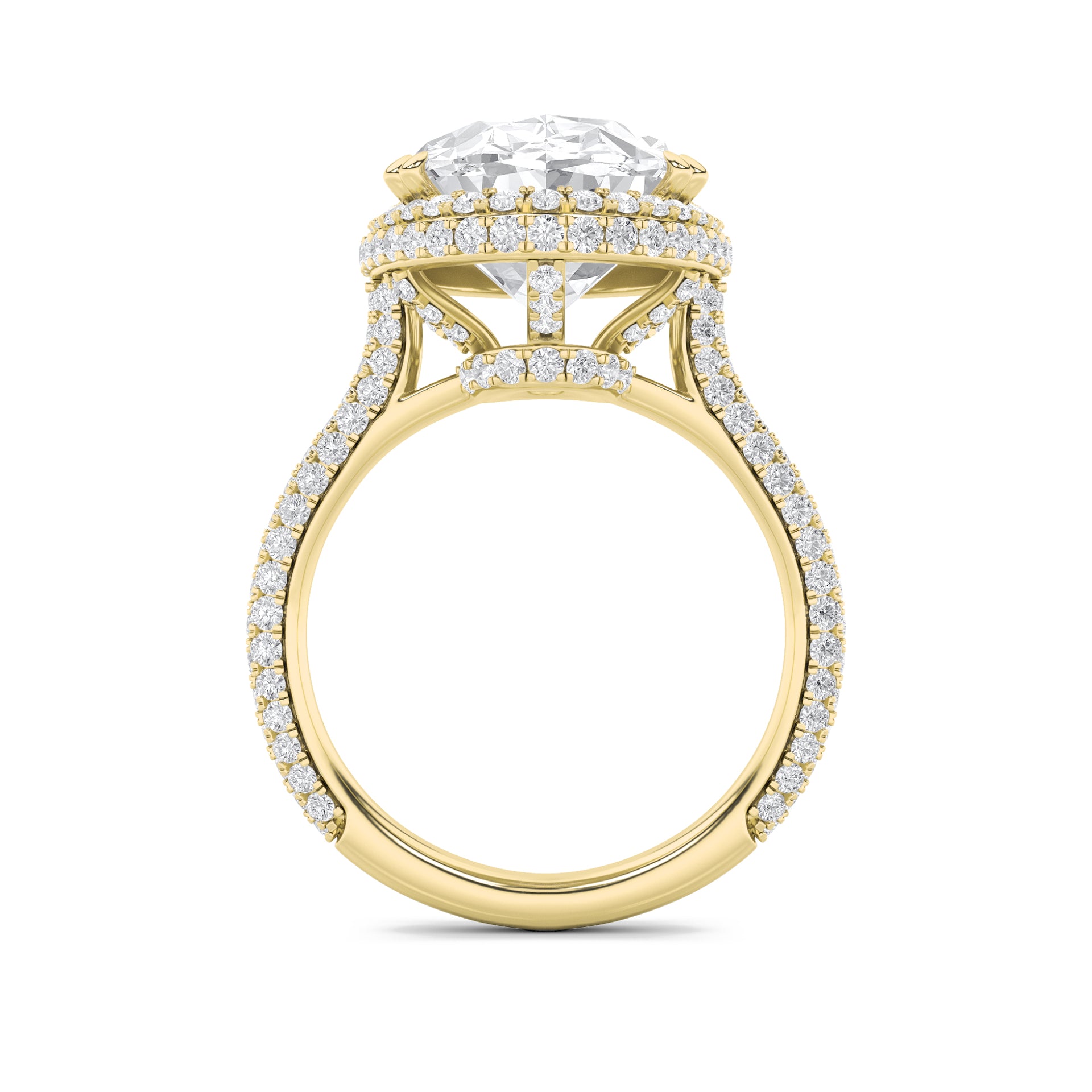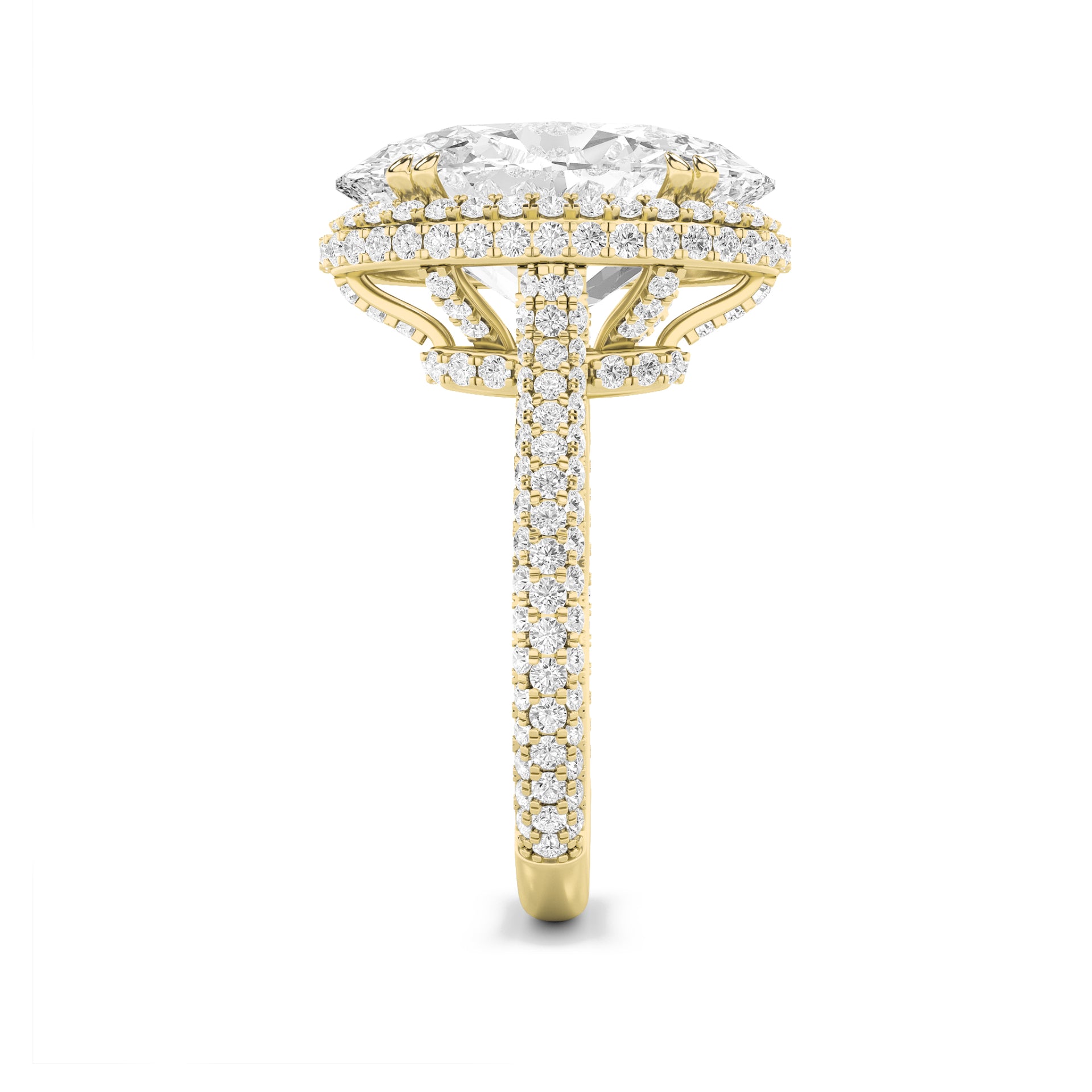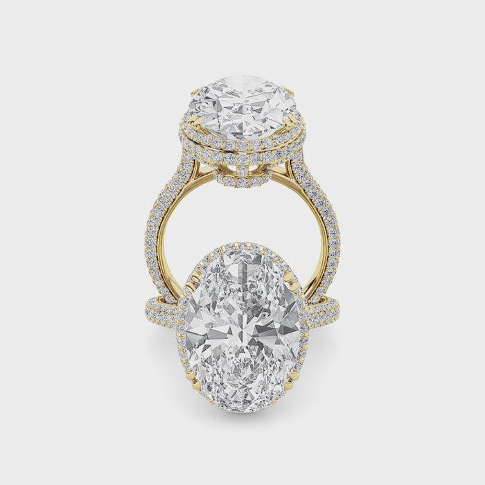 Designed for those who seek brilliance without compromise, this ring features a striking oval-cut diamond encircled by twin halos of round stones. A pavé-set band shimmers endlessly, while the diamond-accented basket beneath adds a refined, secret sparkle. It’s a creation that marries artistry with everlasting romance.
