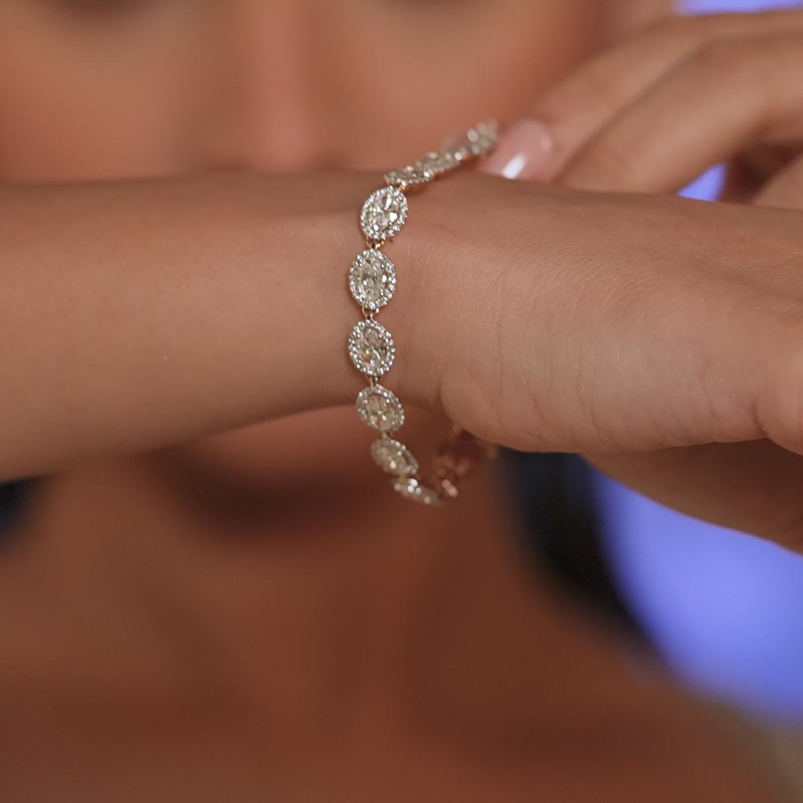Crafted for timeless elegance, this bracelet features a line of round brilliant-cut diamonds, each encased in a delicate halo of pavé stones. The seamless design adds graceful brilliance, making it an ideal choice for everyday luxury or refined gifting.