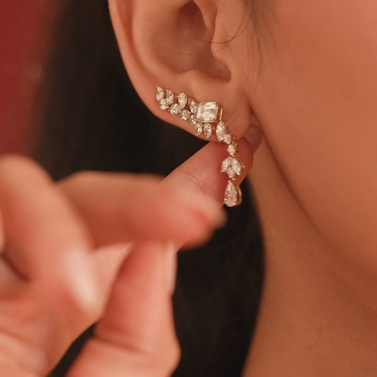 These elegant long earrings blend nature-inspired marquise and pear-shaped diamonds with a radiant emerald-cut centerpiece. The flowing leaf-like pattern gracefully trails from the ear, creating a cascading sparkle.