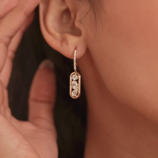 A celebration of distinct diamond shapes, these hoops combine oval brilliance, pear-cut grace, and round sparkle in a sculptural arc that hugs the ear beautifully. Ideal for glamorous evenings.