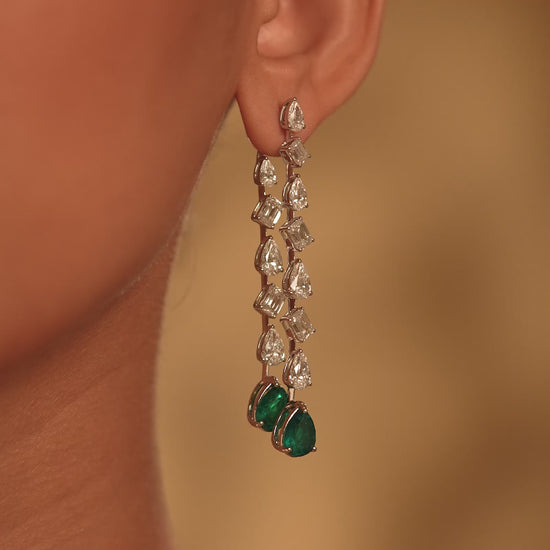 These shoulder-dusting earrings combine rich green pear-shaped semi precious emeralds with alternating rows of pear and emerald-cut diamonds. The cascading design captures fluidity and grandeur, ideal for special occasions that call for regal opulence.