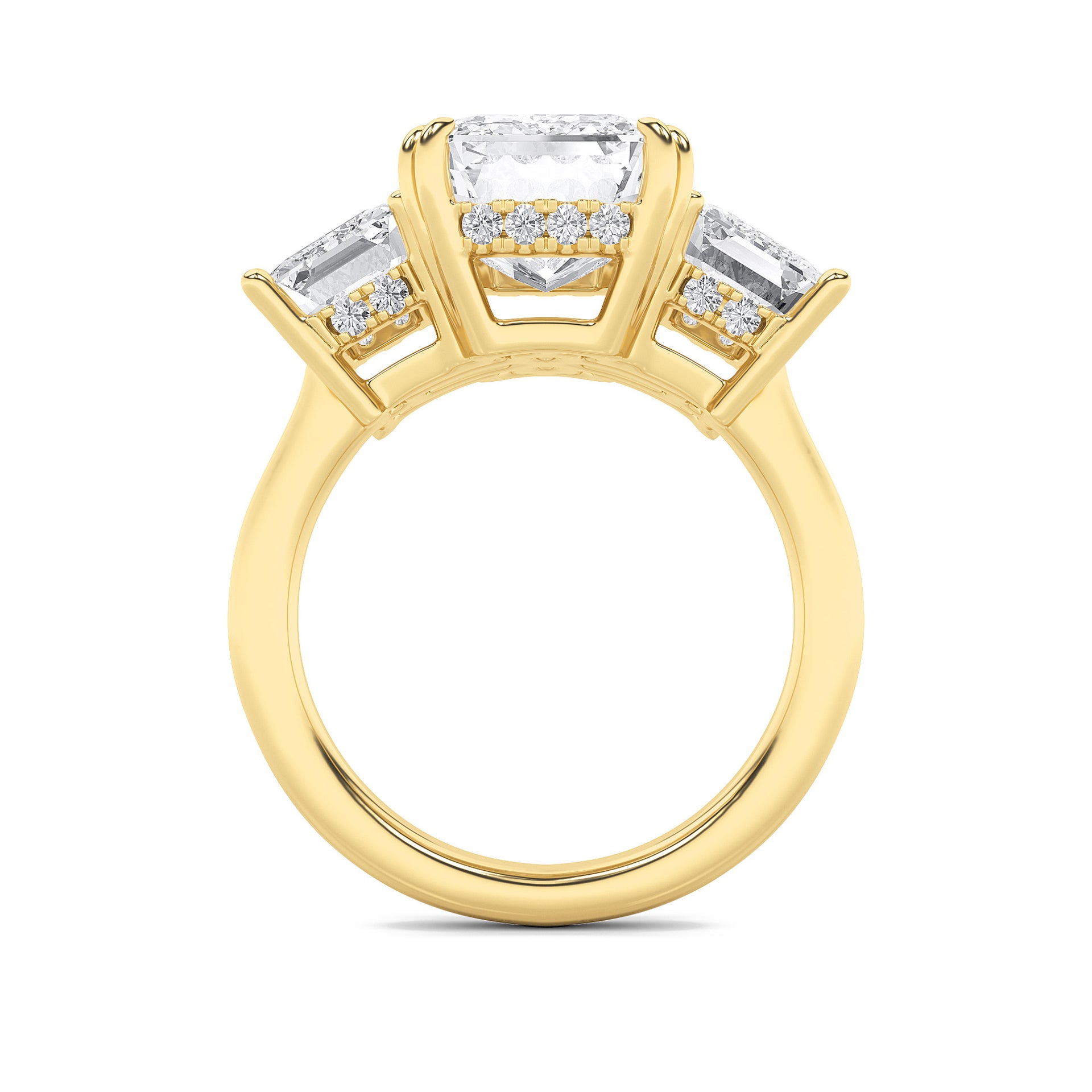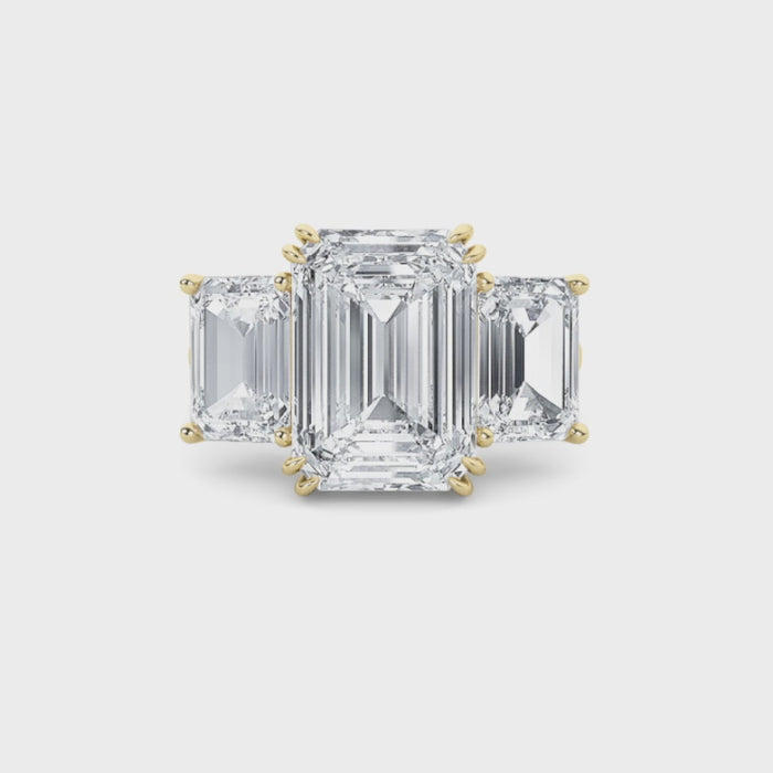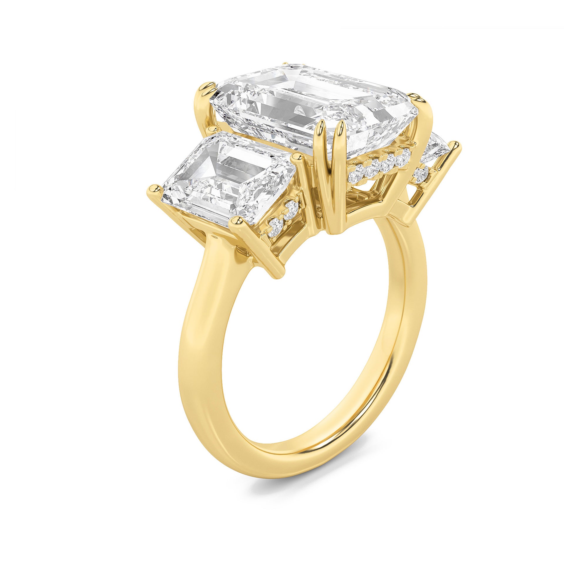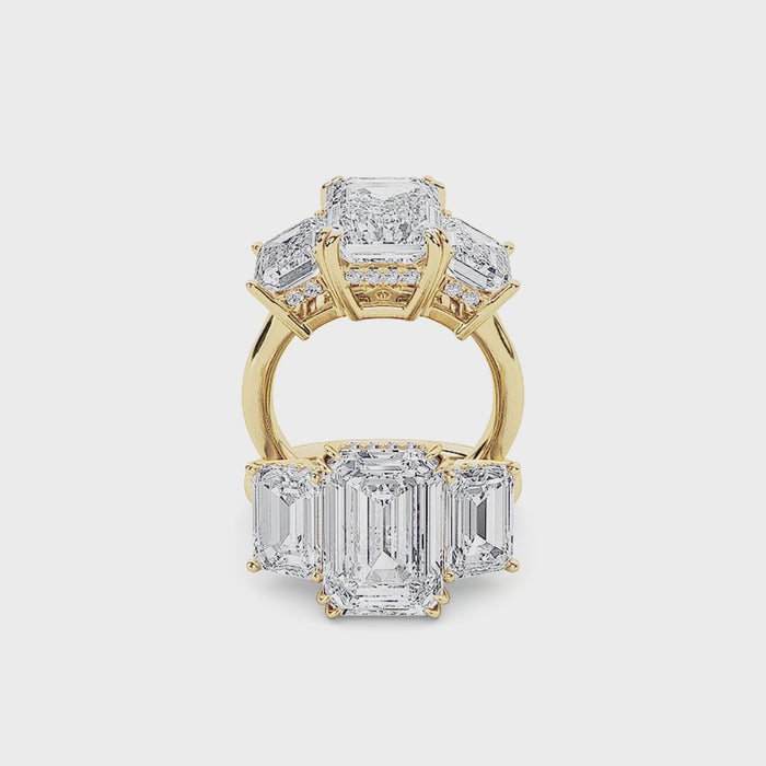 Crafted in luminous gold, this ring features a commanding emerald-cut centerpiece flanked by two emerald side stones, with delicate pavé diamonds beneath, creating a bold, balanced silhouette of timeless sophistication.