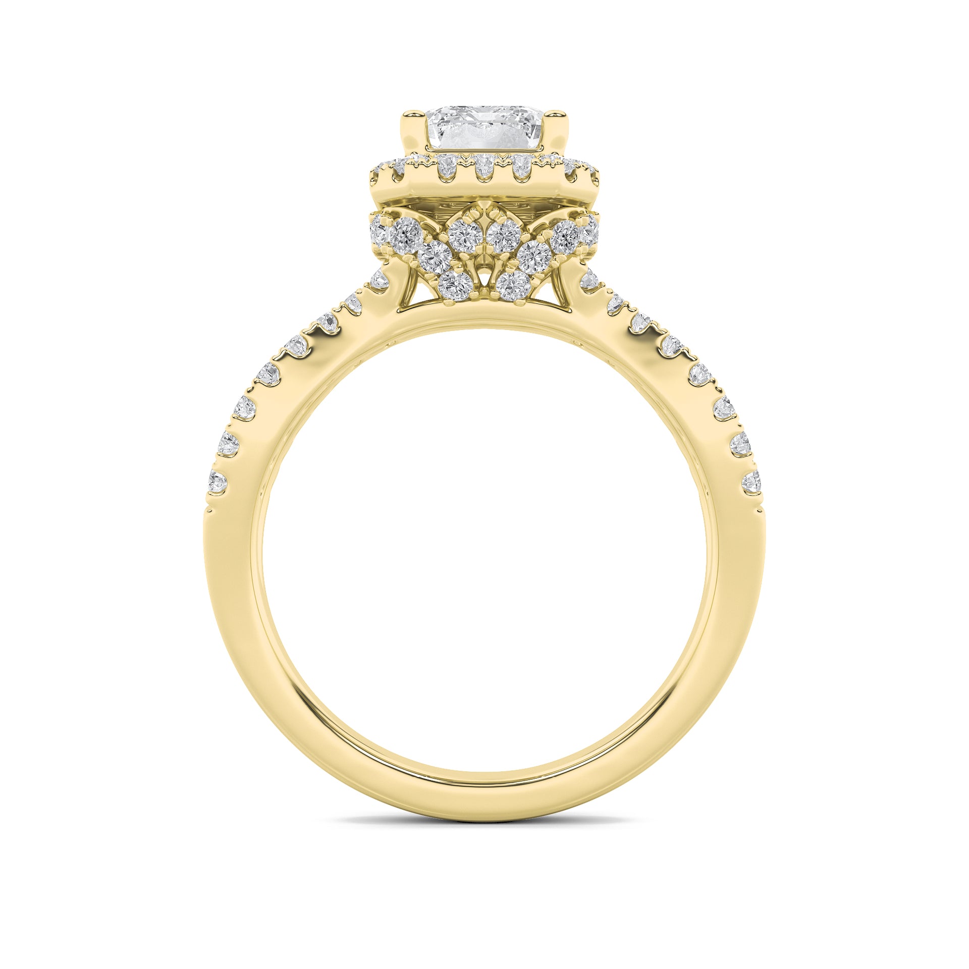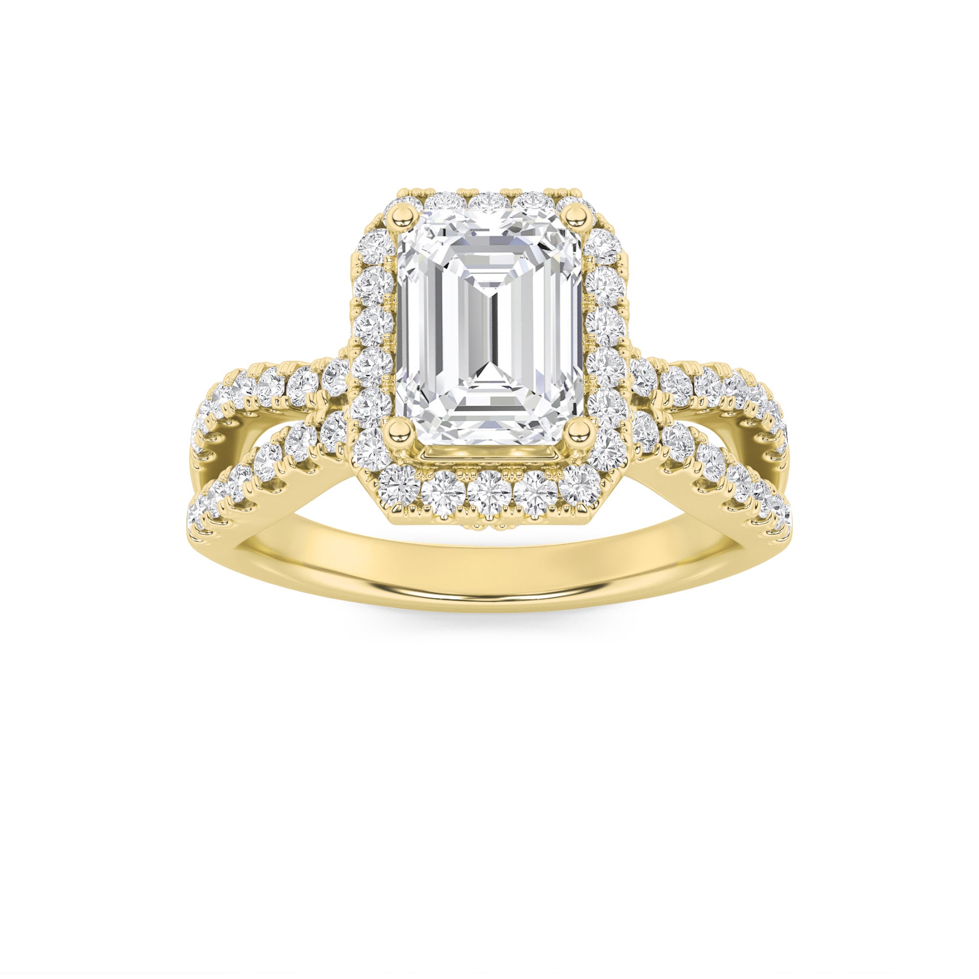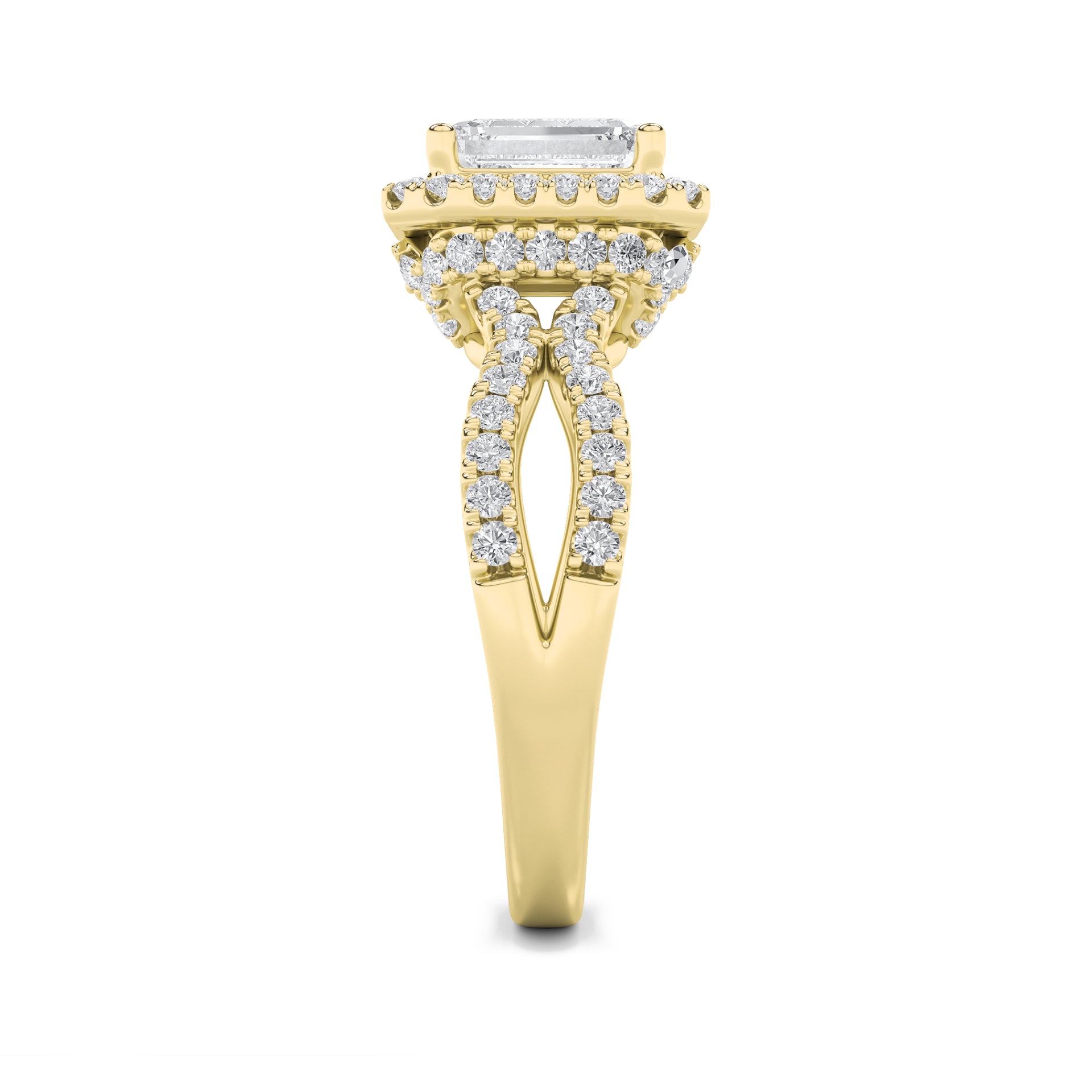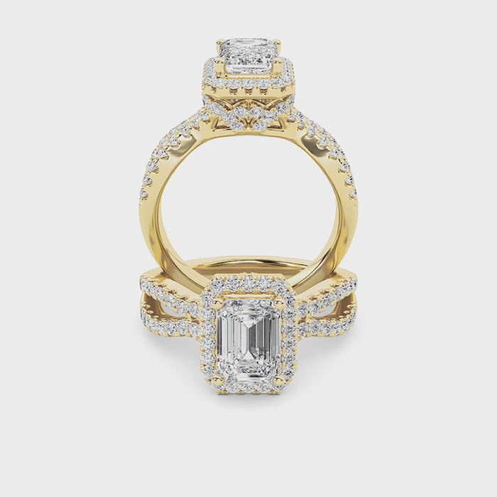 Drawing from the artistry of regal heirlooms, this ring showcases an emerald-cut center that glows with poise. The twin halos amplify brilliance, while the intricate undergallery of pavé diamonds weaves a crown-like design, making it the perfect choice for milestone celebrations and treasures passed across generations.