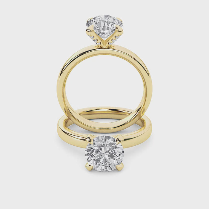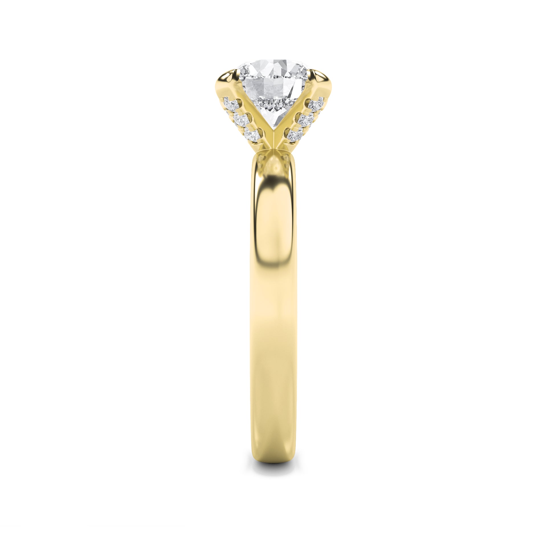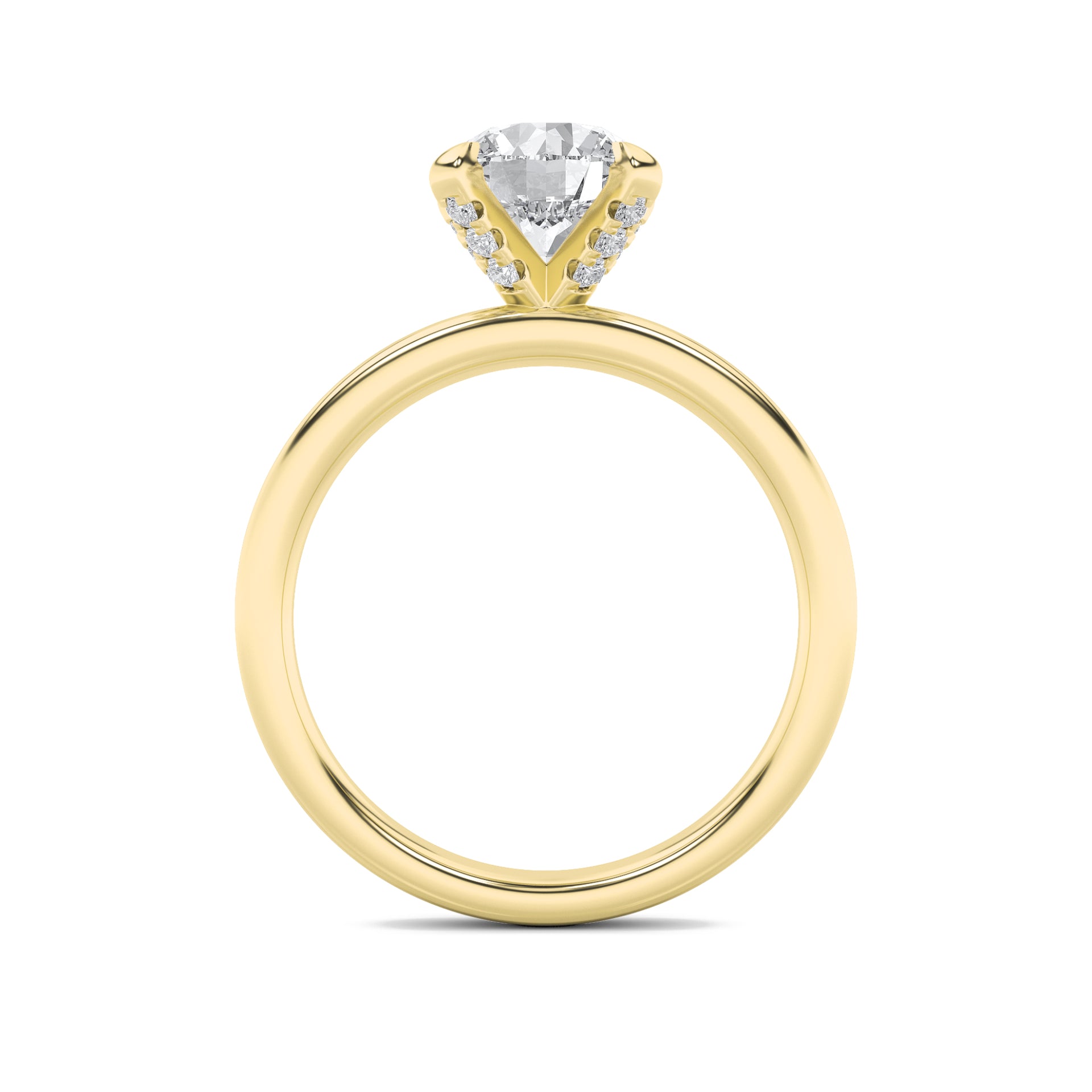 Capturing the warmth of a glowing horizon, this solitaire ring unites a brilliant cushion-cut diamond with pavé-lined prongs that echo rays of light. Clean lines and modern symmetry give it a contemporary elegance, perfect for the bride who envisions love as an ever-expanding journey.