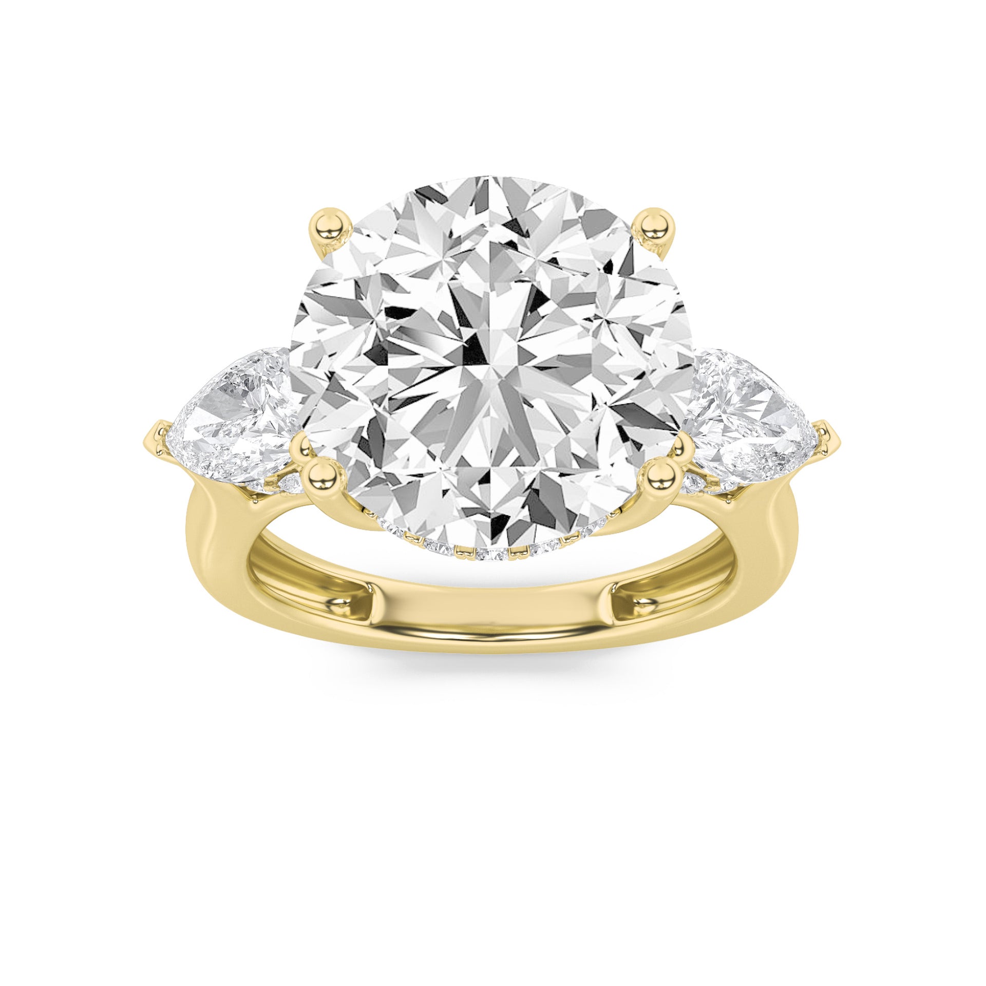 Symbolizing past, present, and future, this ring features a radiant round-cut centerpiece with pear-cut side diamonds, offering a design of elegance, meaning, and brilliant craftsmanship.