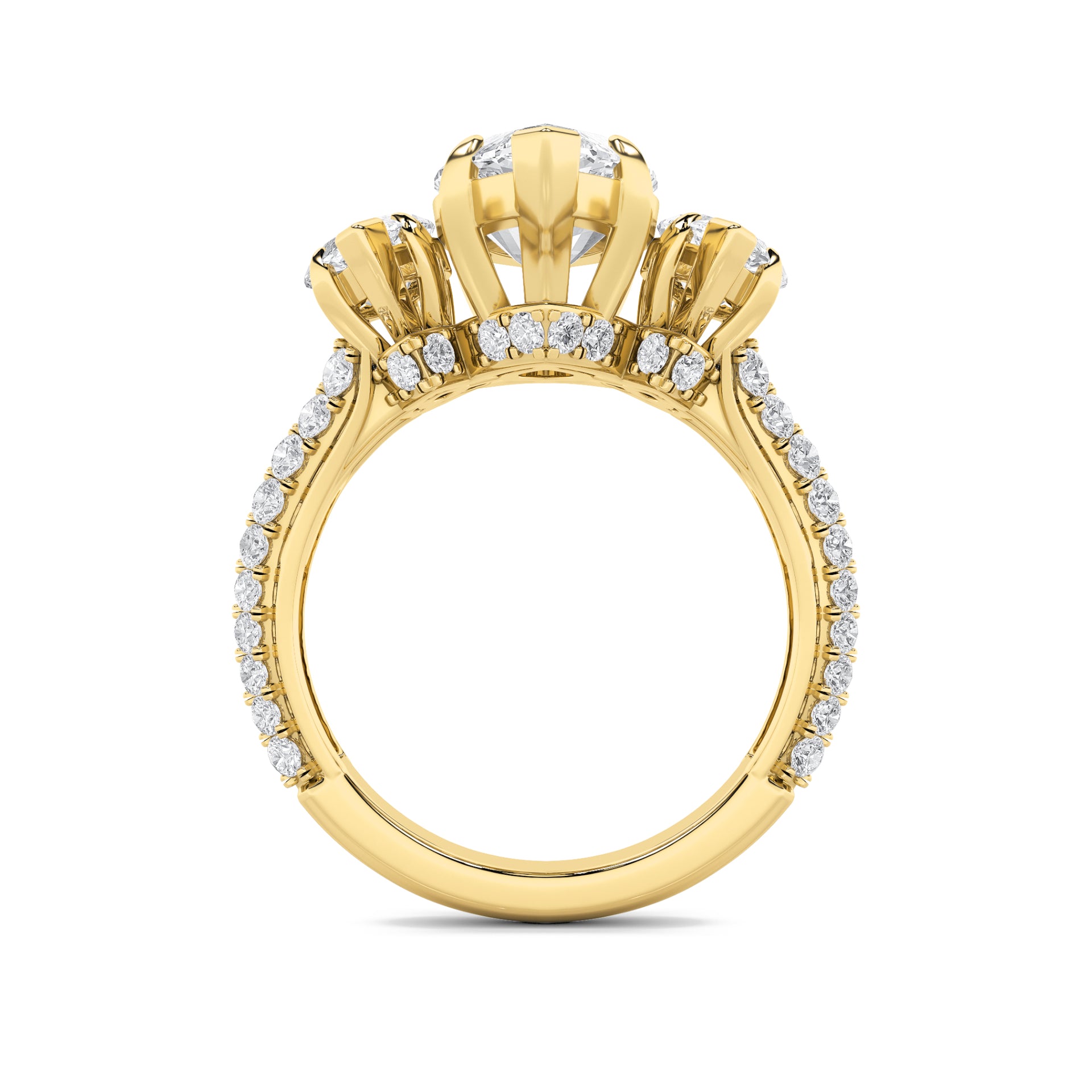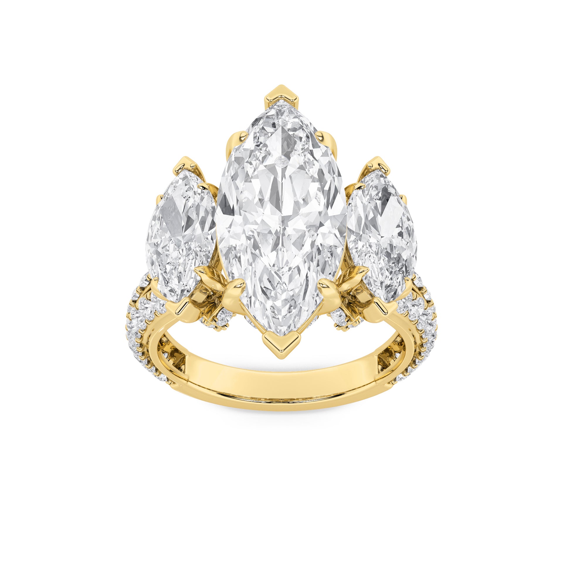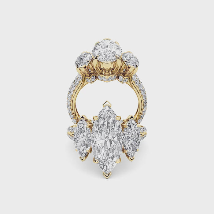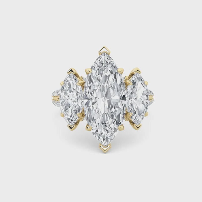 Inspired by heirloom artistry, this ring highlights a striking marquise-cut diamond with two side marquise stones. Pavé accents enrich the band, blending traditional elegance with enduring craftsmanship.