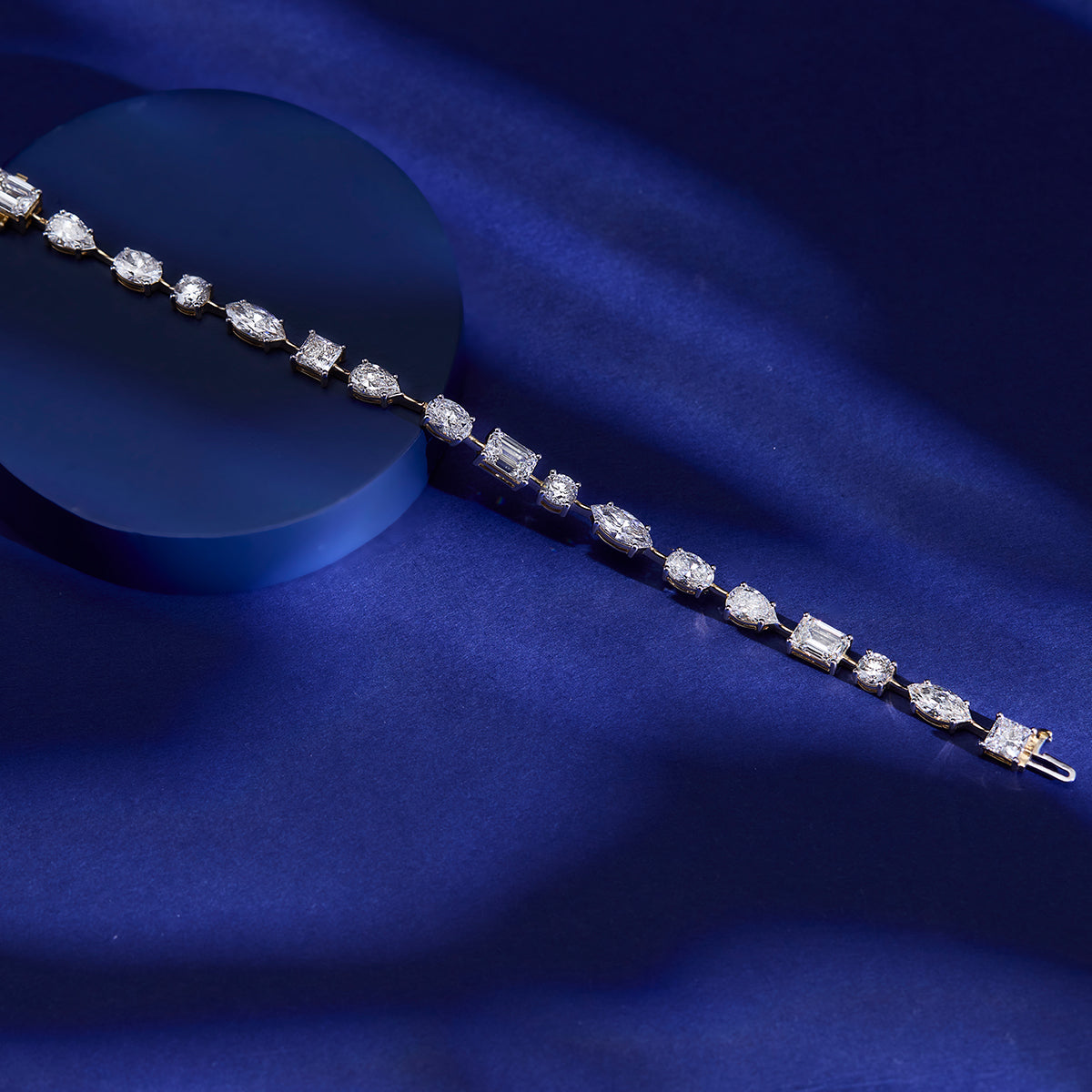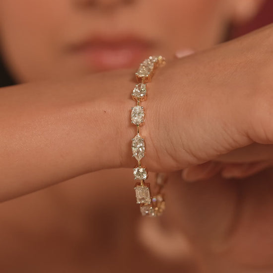 A celebration of diamond diversity, this bracelet features oval, pear, emerald, marquise, princess and round brilliant diamonds in a seamless design. It’s a radiant statement of sophisticated styling.