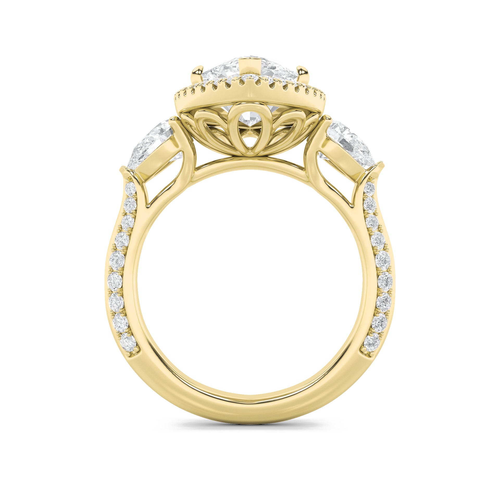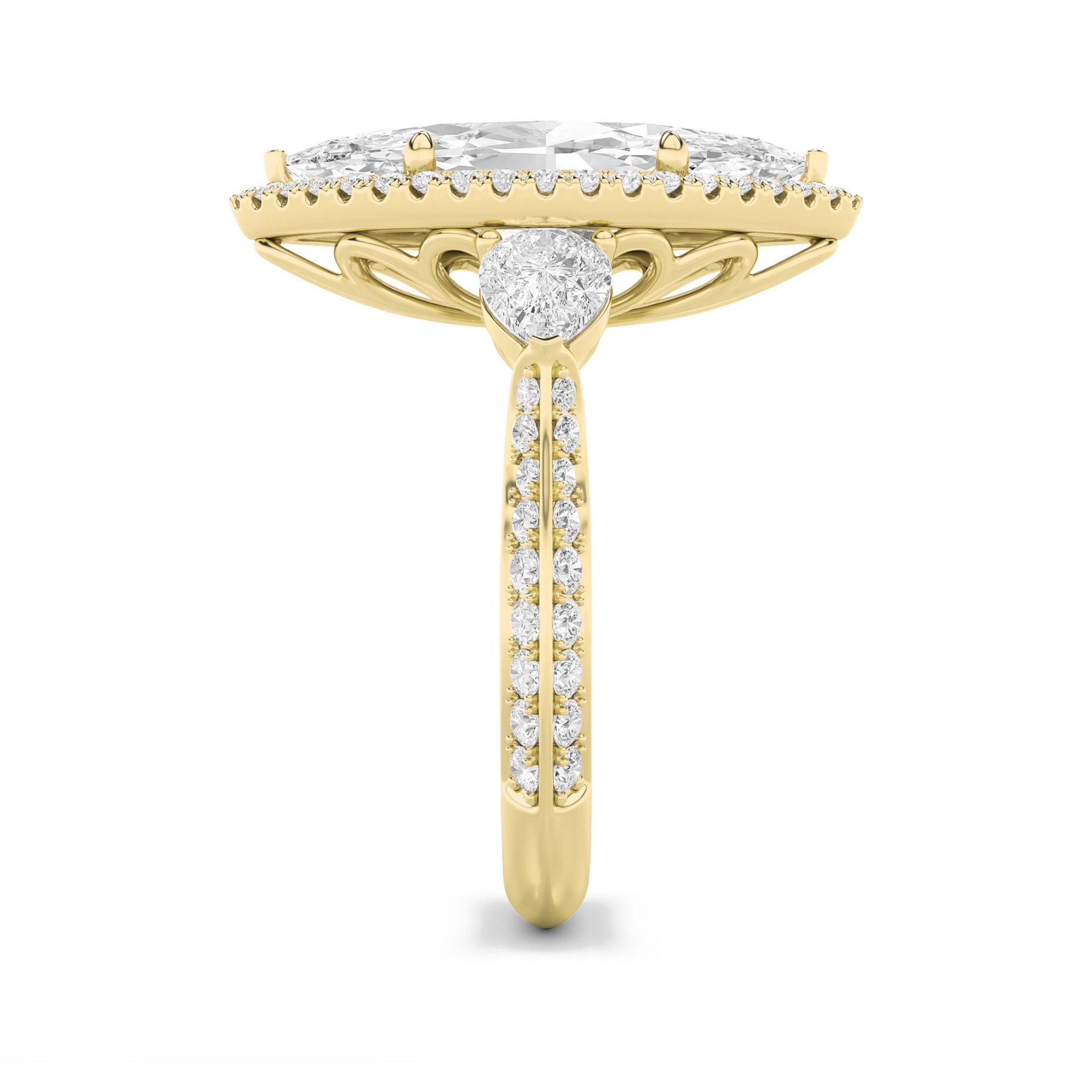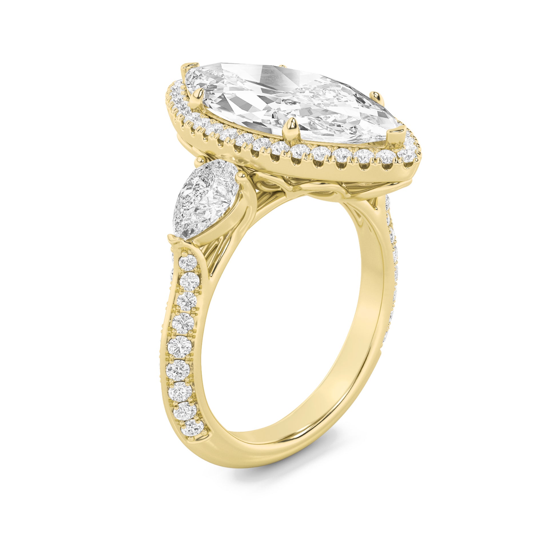 This elegant ring features a bold marquise-cut center diamond encircled by a halo, enhanced with side marquise stones and pavé-set diamonds that add brilliance across the golden shank..
