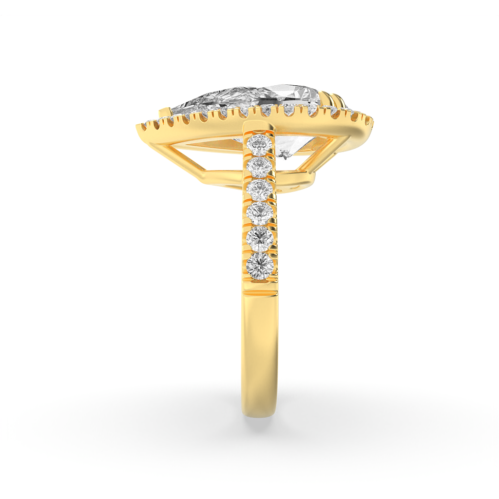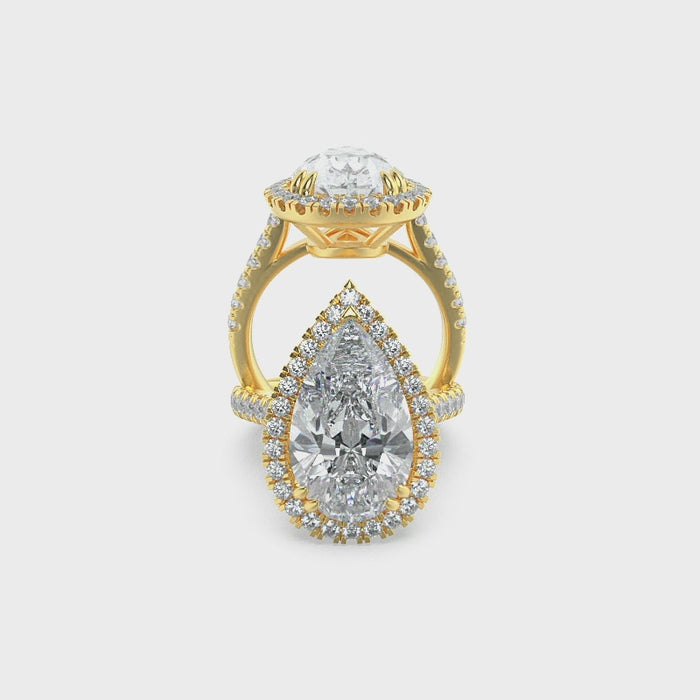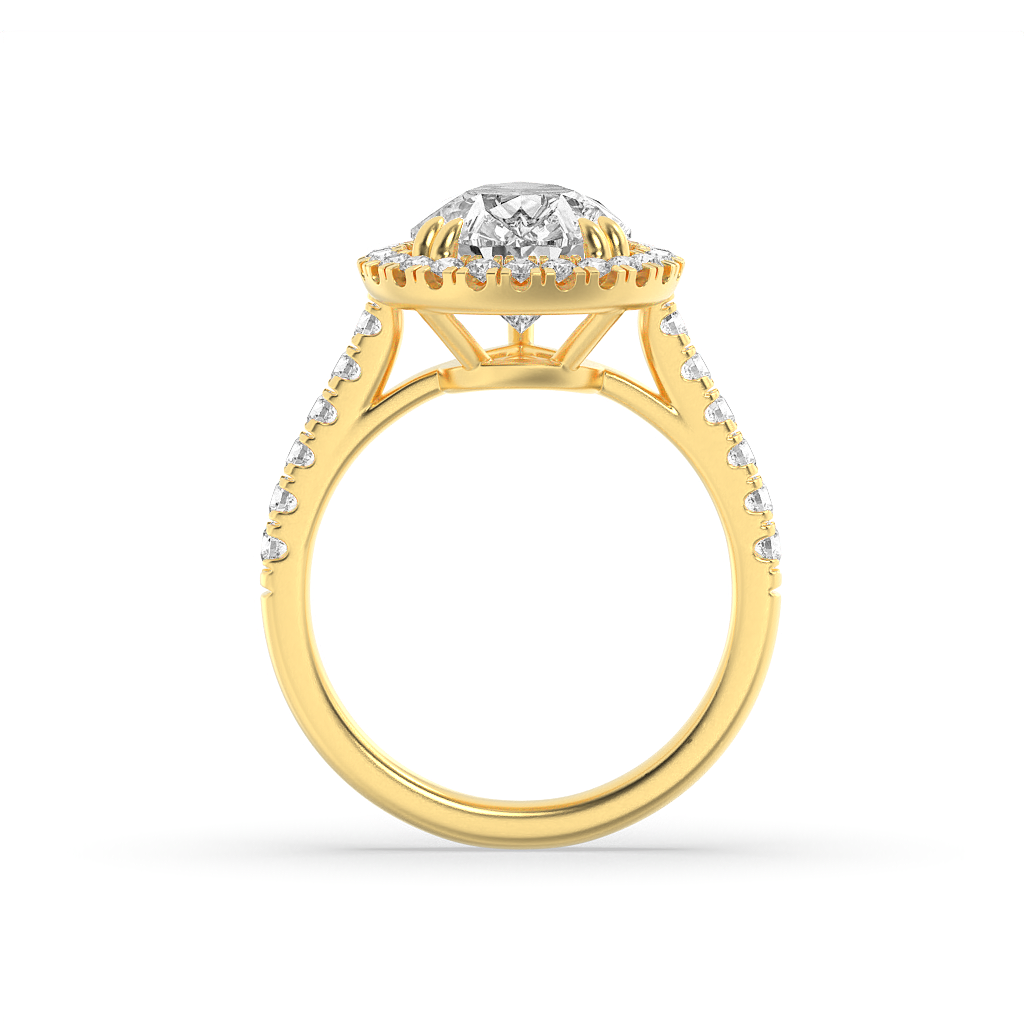A brilliant pear diamond commands attention, haloed by a constellation of sparkling stones. With pavé accents enhancing the shank, this masterpiece draws inspiration from celestial light, designed for those who embrace grandeur and luminous beauty.