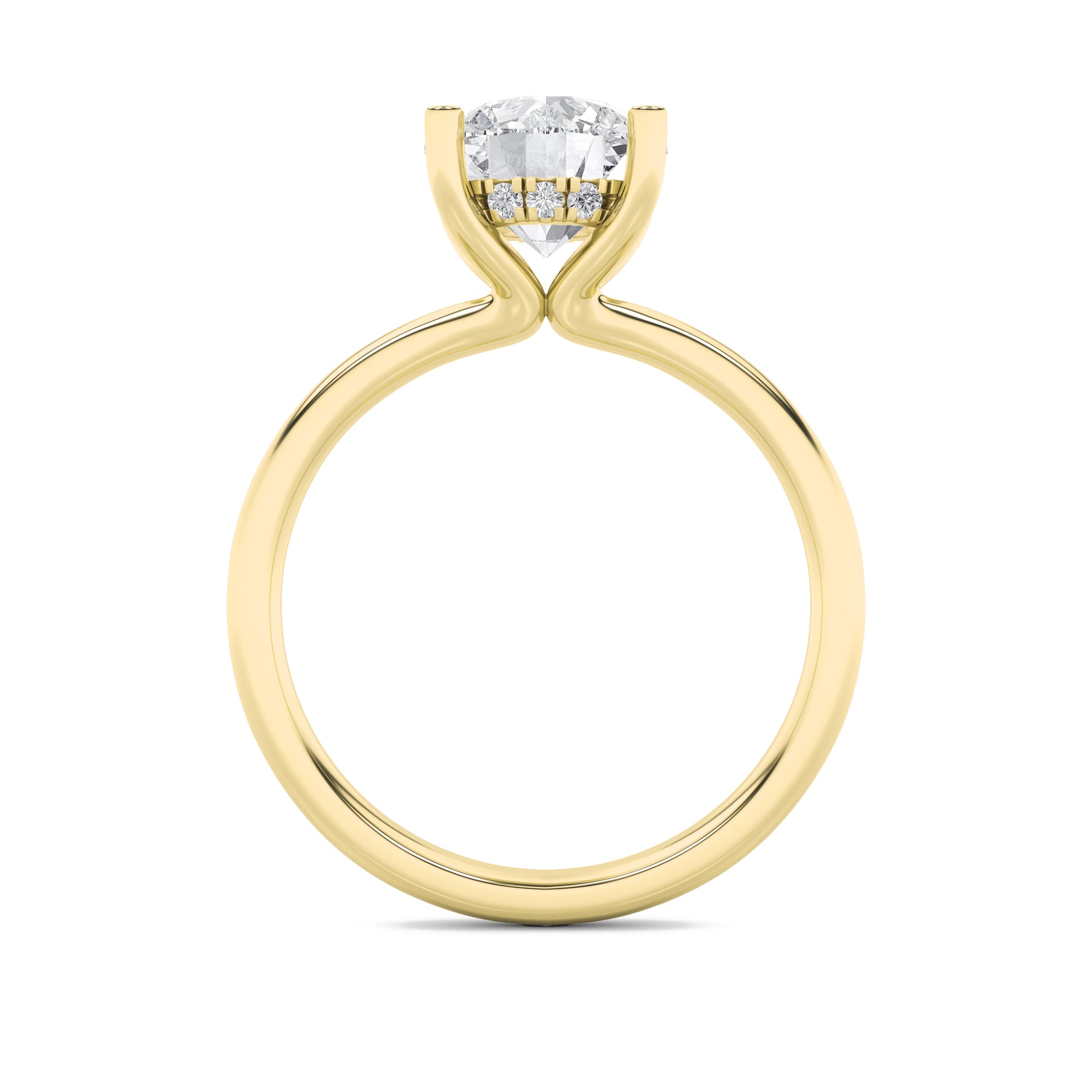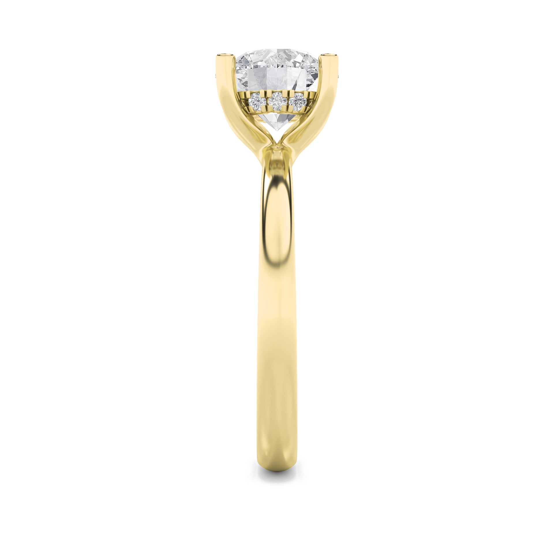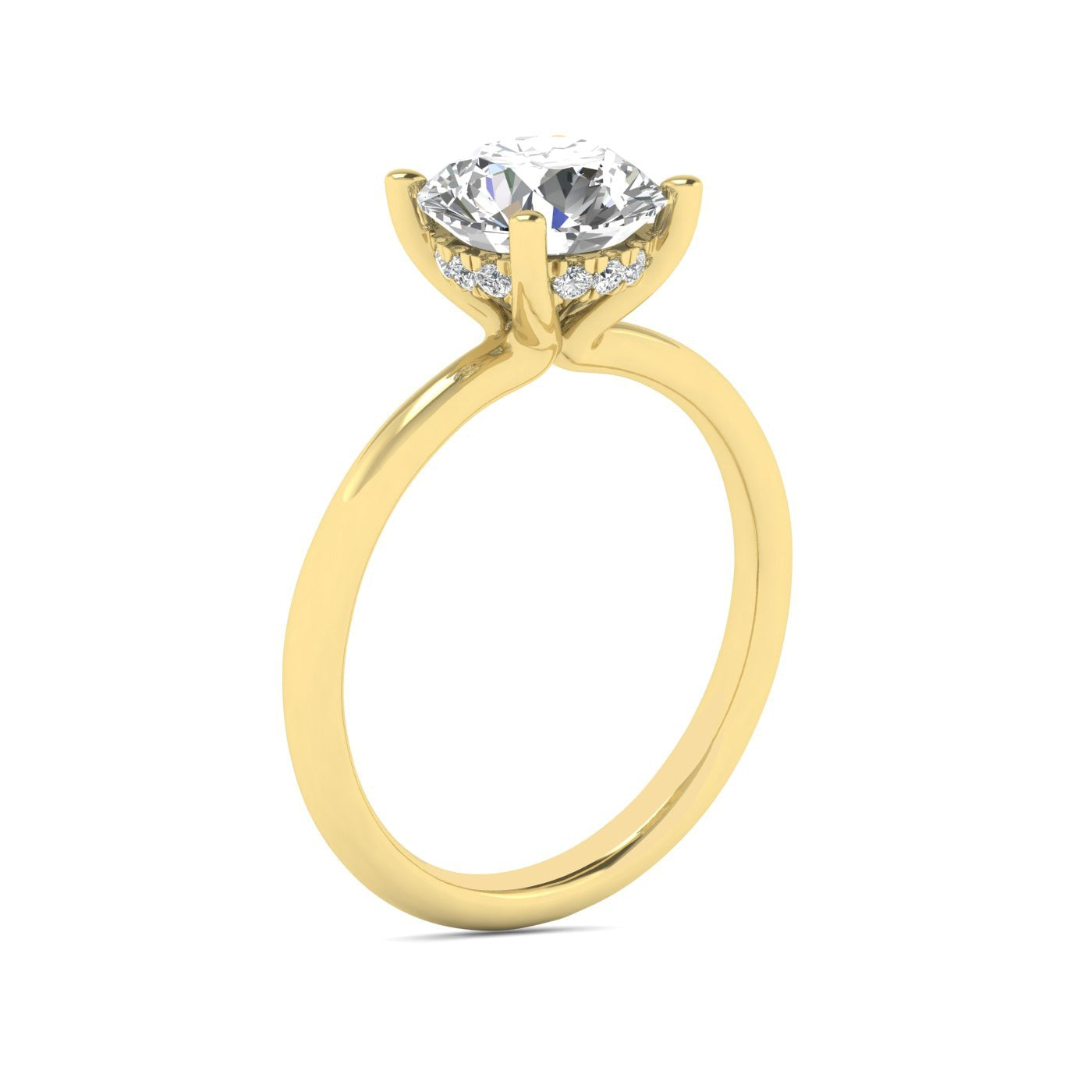 Light dances through the hall of facets in this round-cut solitaire, rising above subtle under-halo detail. Refined yet bold, it balances strength with grace, a style destined for those who treasure simplicity with depth. Ideal for engagements or heirloom moments.