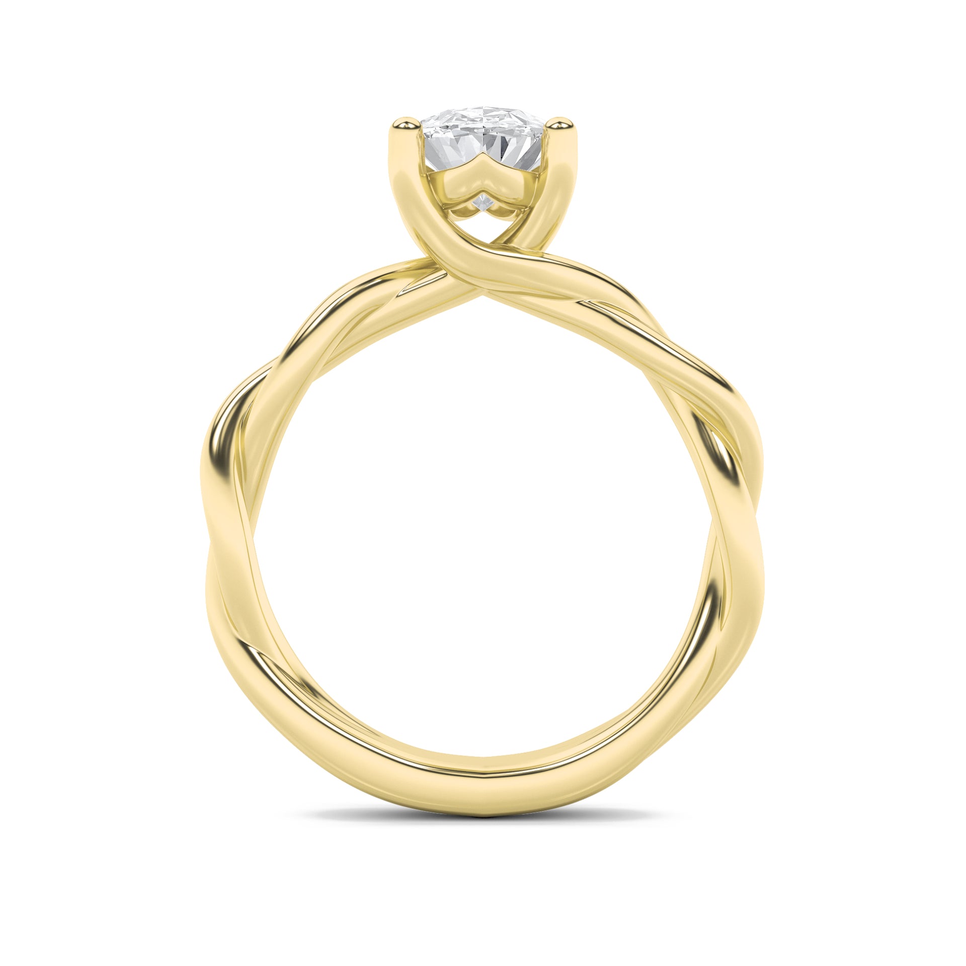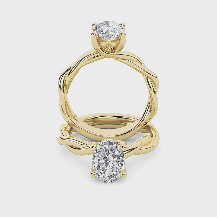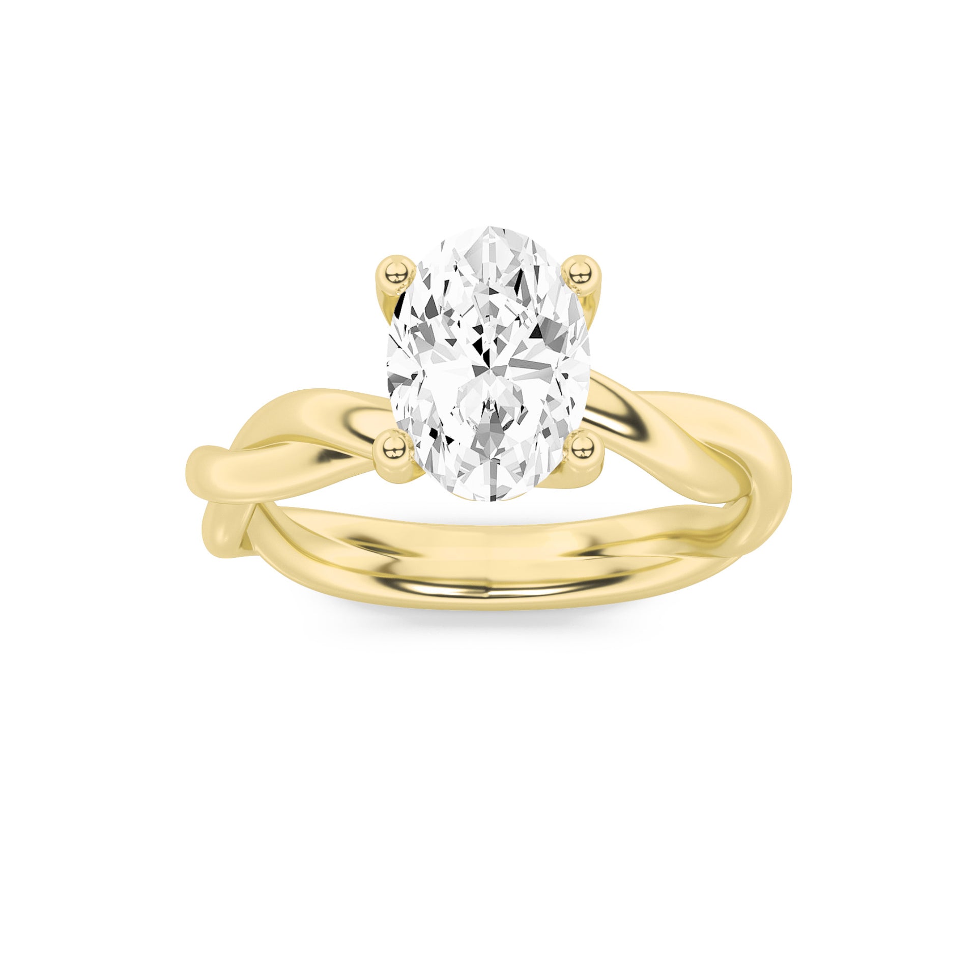 The sleek twisted band embraces an oval diamond solitaire, striking a balance between contemporary flair and timeless romance. Its sculpted curves echo modern artistry, while the oval center radiates graceful brilliance. A versatile jewel, it shines as brightly in milestone proposals as it does in everyday elegance, seamlessly complementing every style with refined charm.