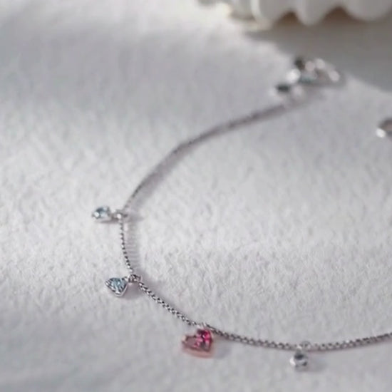 This enchanting bracelet features round diamonds delicately suspended along a fine chain. The standout pink heart at the center adds a romantic and vibrant twist to the timeless design.