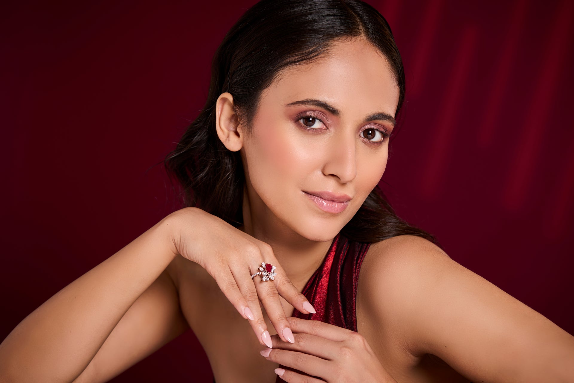 A semi precious ruby sits at the heart of this floral-inspired ring, surrounded by pear and marquise-cut diamonds that radiate like petals. Set in gleaming gold, this cocktail ring is a vibrant statement of elegance.