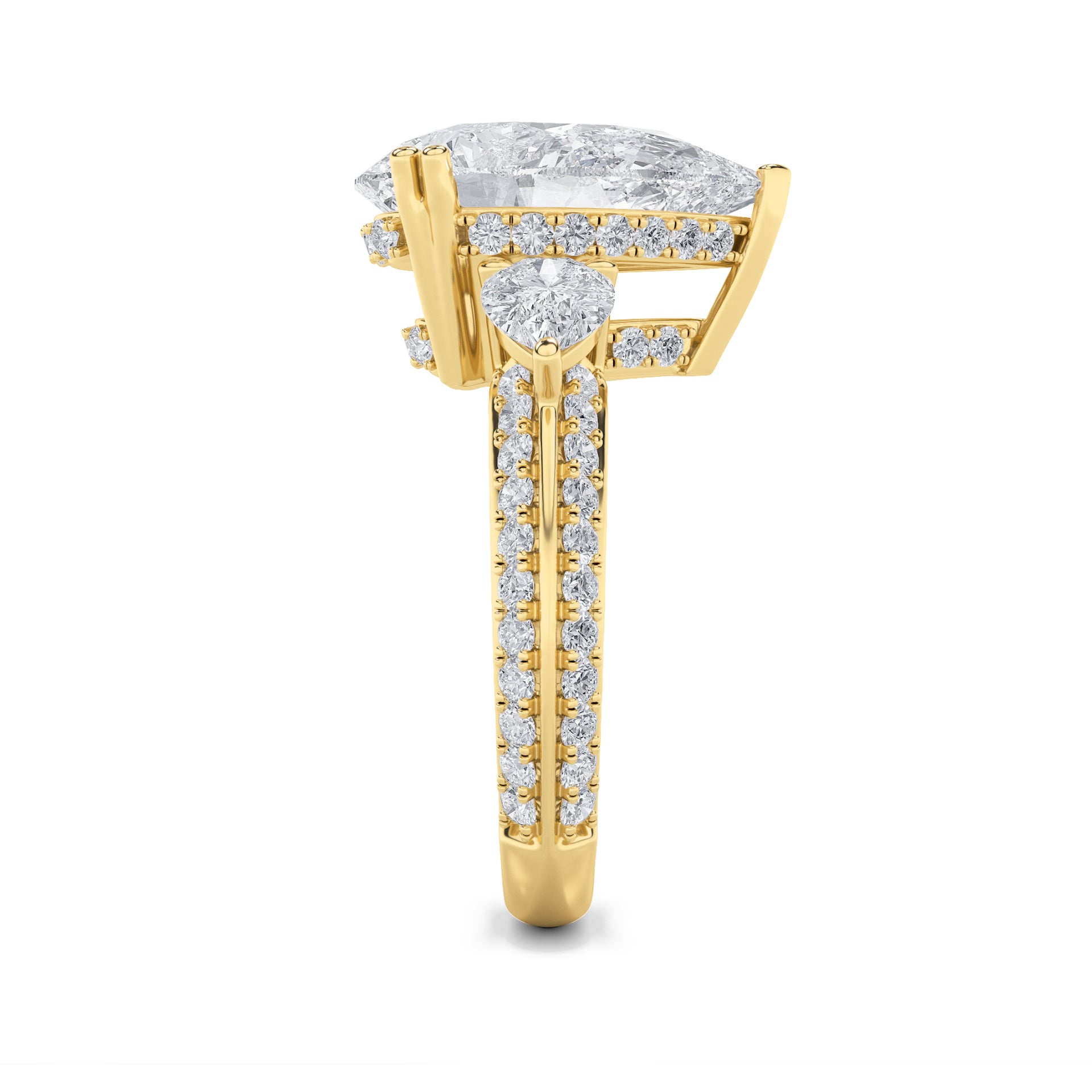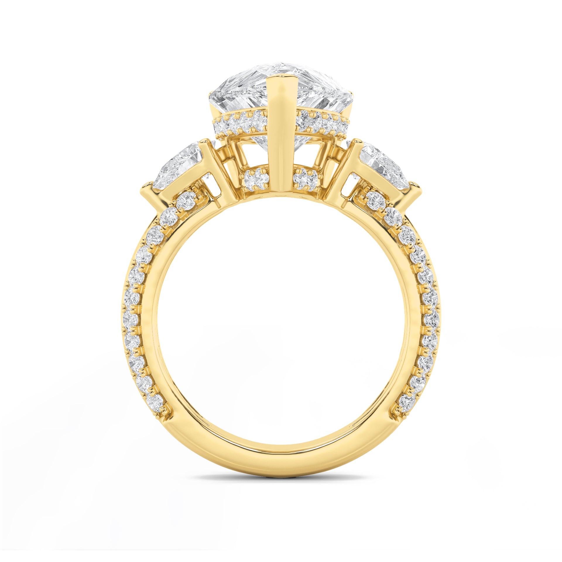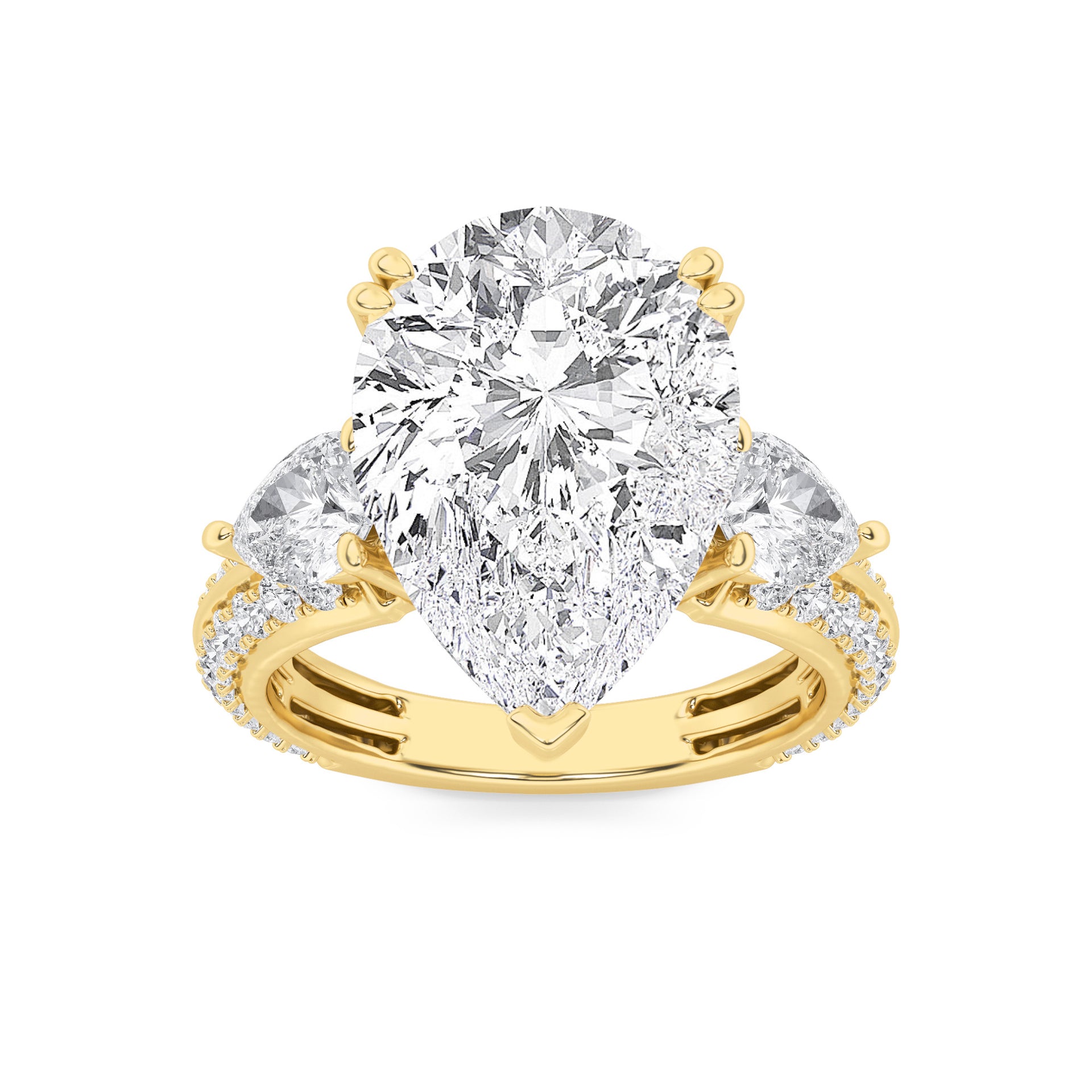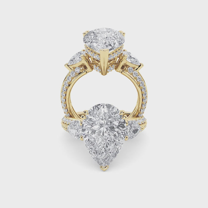 Celebrate life’s most cherished moments with this heirloom ring, starring a bold pear-cut diamond flanked by pear side stones. Pavé detailing enhances the sparkle, creating an elegant symbol of commitment and style.