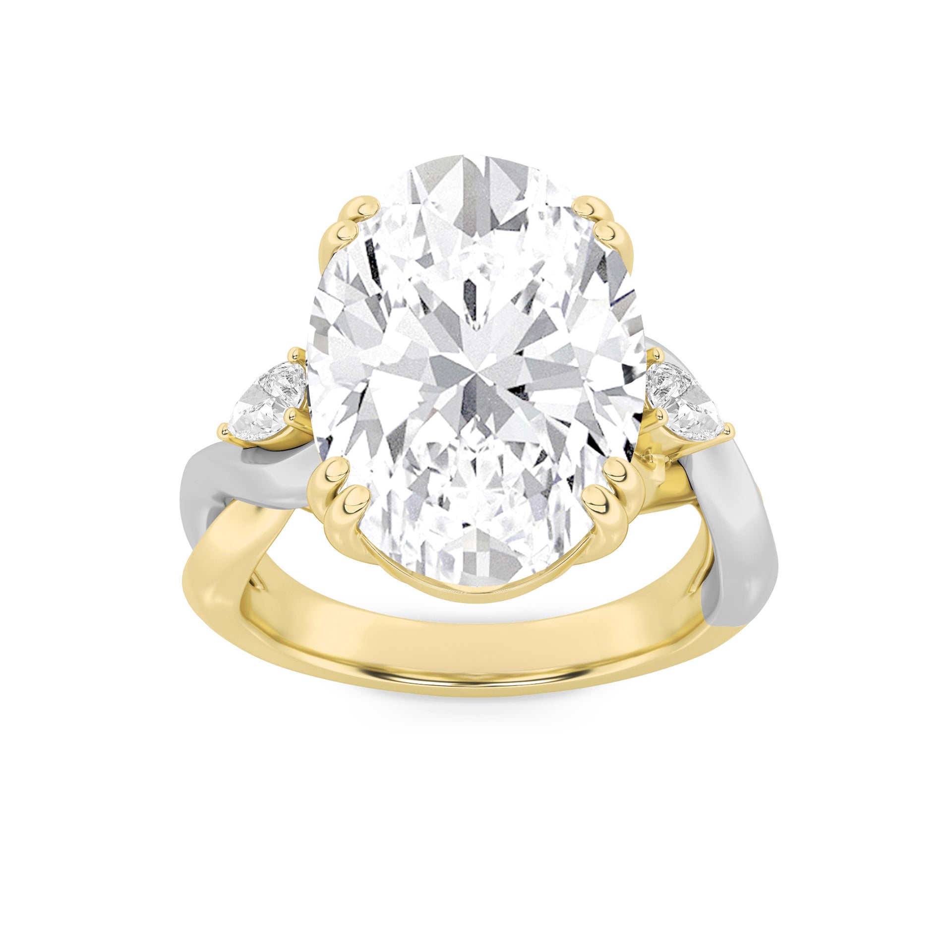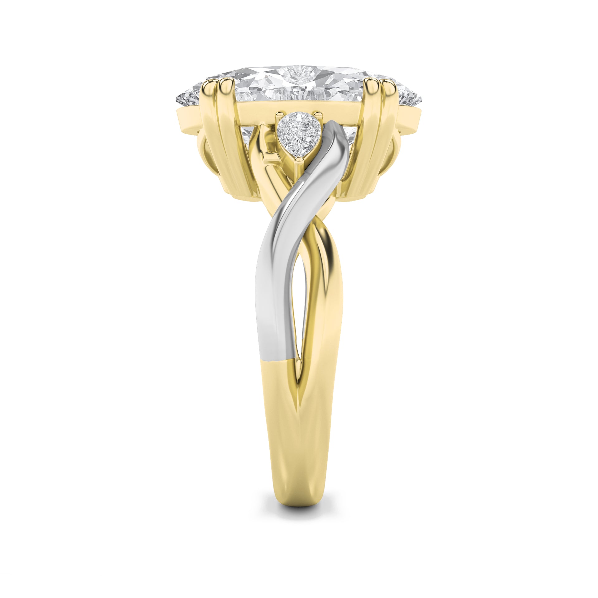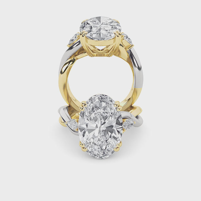 A luminous oval diamond takes center stage, accentuated by marquise accents that frame its graceful proportions. The two-tone intertwined band adds depth and symbolism, reflecting the harmony of two paths becoming one. A timeless jewel for heirloom moments, it’s designed to be worn at weddings, anniversaries, and treasured family celebrations.