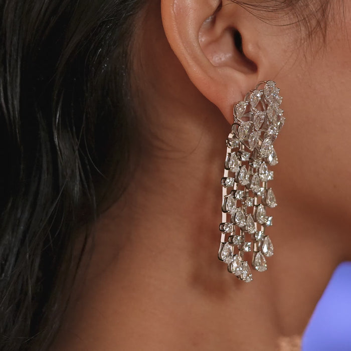 An opulent blend of elegance and movement, these earrings cascade with multiple rows of pear and round diamonds for unmatched sparkle. A perfect fusion of traditional charm and contemporary design, ideal for formal celebrations or bridal glamour.