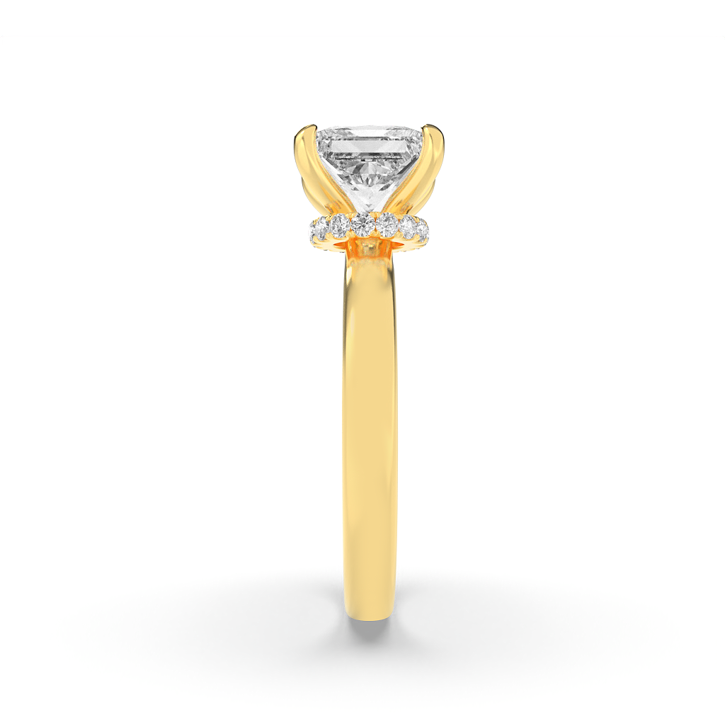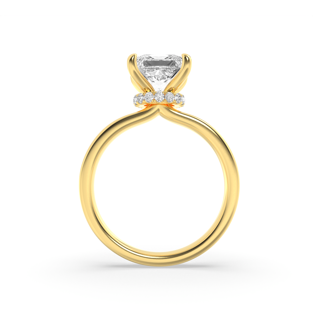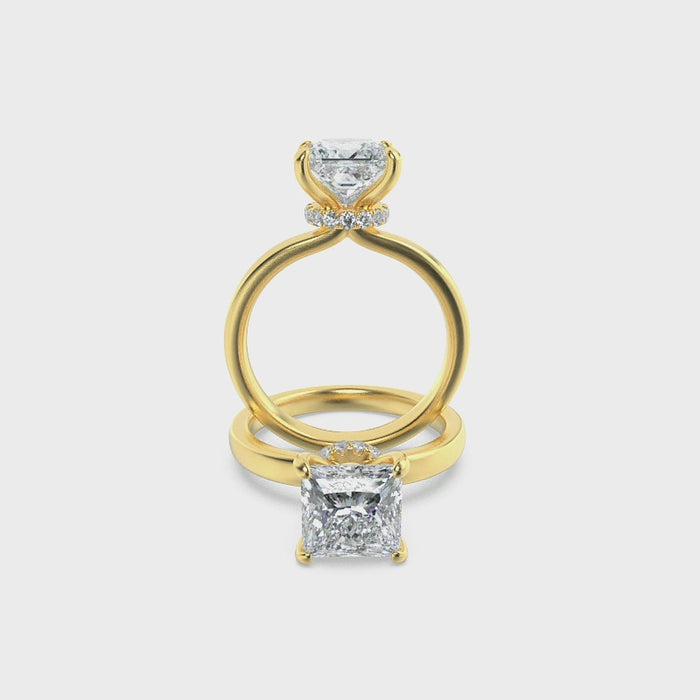 Balancing minimalism with a touch of surprise, the princess-cut solitaire rises above a hidden halo of pavé brilliance. Set on a sleek rose band, this design is crafted for the modern bride who values understated elegance with a radiant twist. Pair it with slim pavé bands for a stacked bridal look, or let it shine solo as a timeless engagement statement.